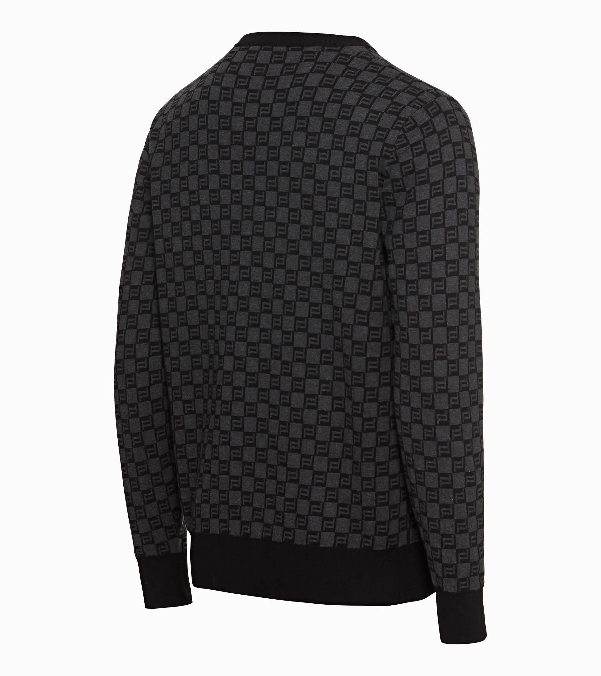 Maglione di marca da uomo in maglia jacquard Porsche Design in cotone. L'esclusivo maglione firmato a scacchi con girocollo crea un effetto sportivo ed elegante.