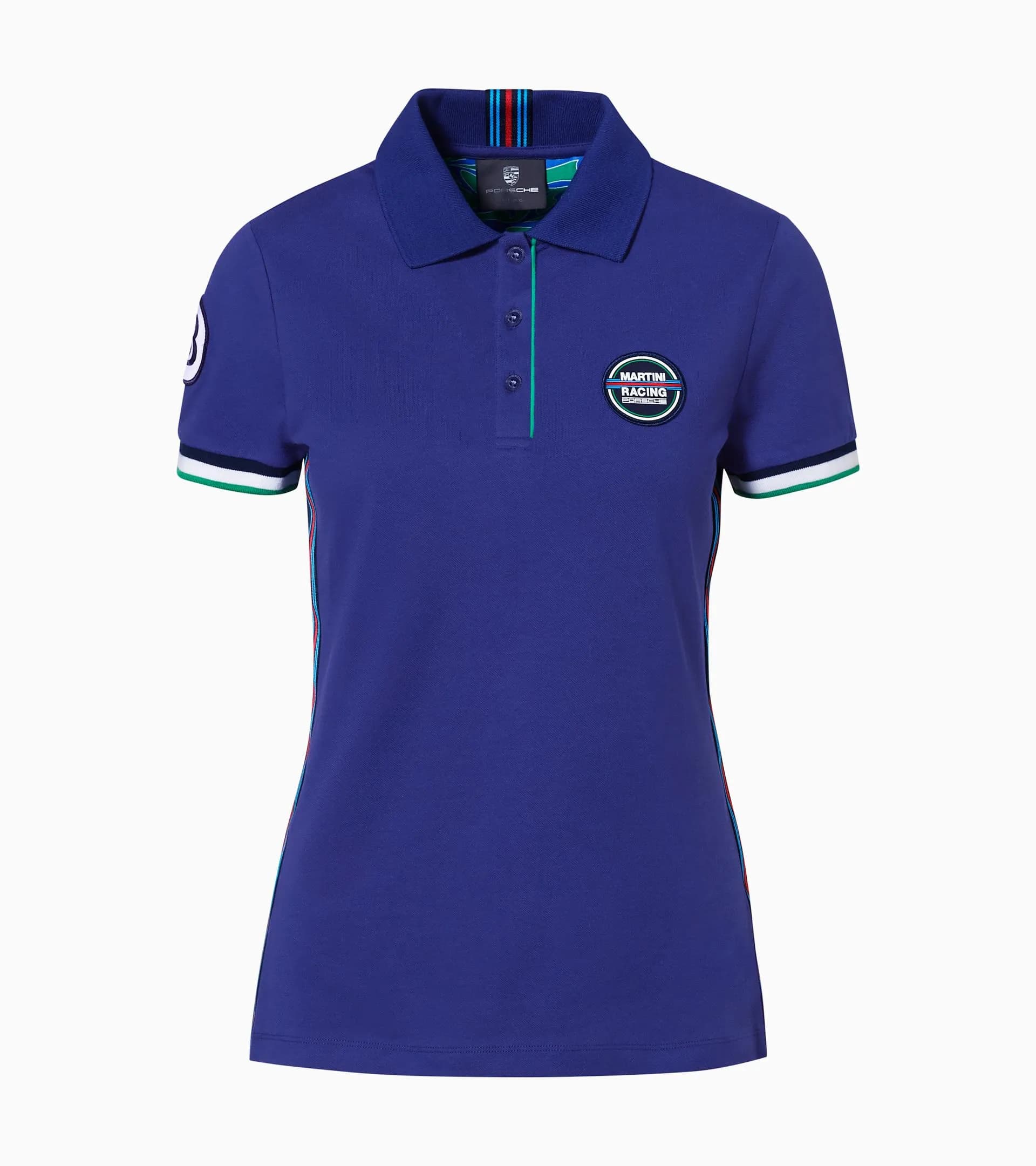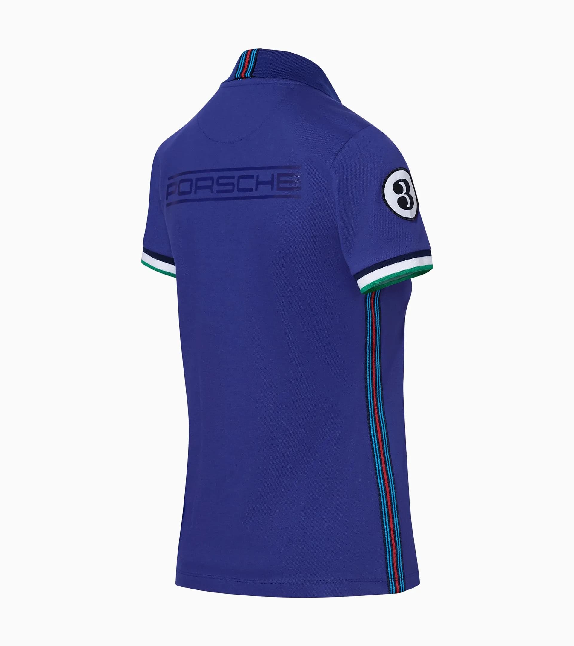 Polo a mezza manica con 3 bottoni. Cuciture e colletto con fascia decorativa nei tipici colori MARTINI RACING®. Spalle e collo con fascia nei tipici colori MARTINI RACING®. Distintivo «MARTINI RACING® PORSCHE» sul petto e distintivo con numero 3 sull'avambraccio. Scritta «PORSCHE» tono su tono stampata sulla schiena. Risvolto del collo ispirato alla Porsche 917 «Hippie».
