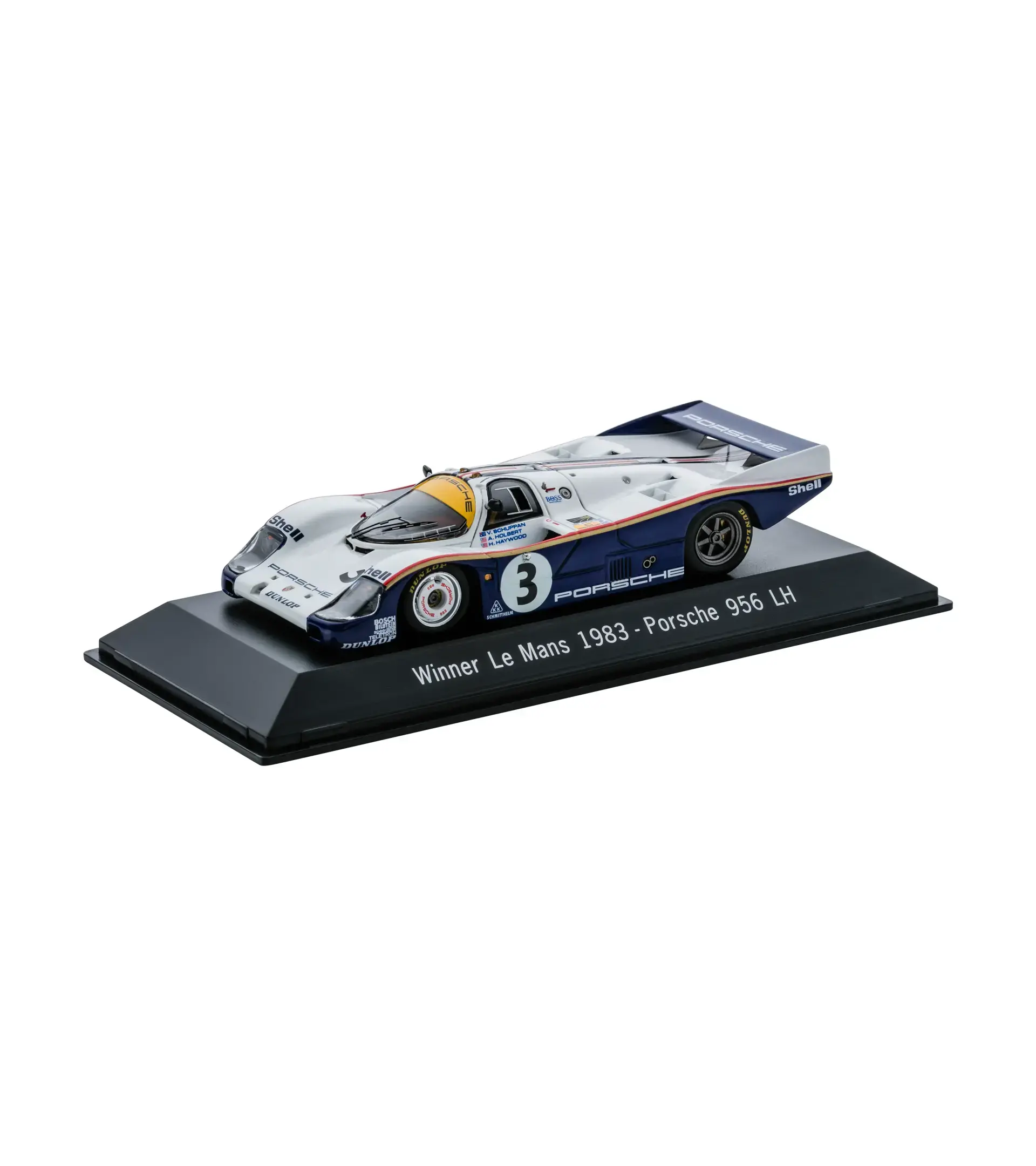 Sulla libreria o sulla scrivania, il prezioso modello da collezione della Porsche 956 non passa di certo inosservato. Grazie all'apposita confezione regalo fornita, è perfetto per un piccolo presente di grande effetto. Porsche sviluppa la 956 per la 24 Ore di Le Mans e il Gruppo C del Campionato del mondo sportprototipi del 1982. Il debutto a Le Mans si conclude con una tripla vittoria, mentre il pilota ufficiale Jacky Ickx vince il Campionato del mondo sportprototipi. Un'altra 956 viene costruita per la seconda stagione nel 1983. Questa vettura, con il numero di telaio 956005, ottiene ottimi piazzamenti, conquistando diversi secondi posti e vincendo la 24 Ore del Nürburgring e la 1.000 chilometri di Spa.La 956 e il successivo modello 962 C dominano le gare endurance fino alla fine degli anni '80.