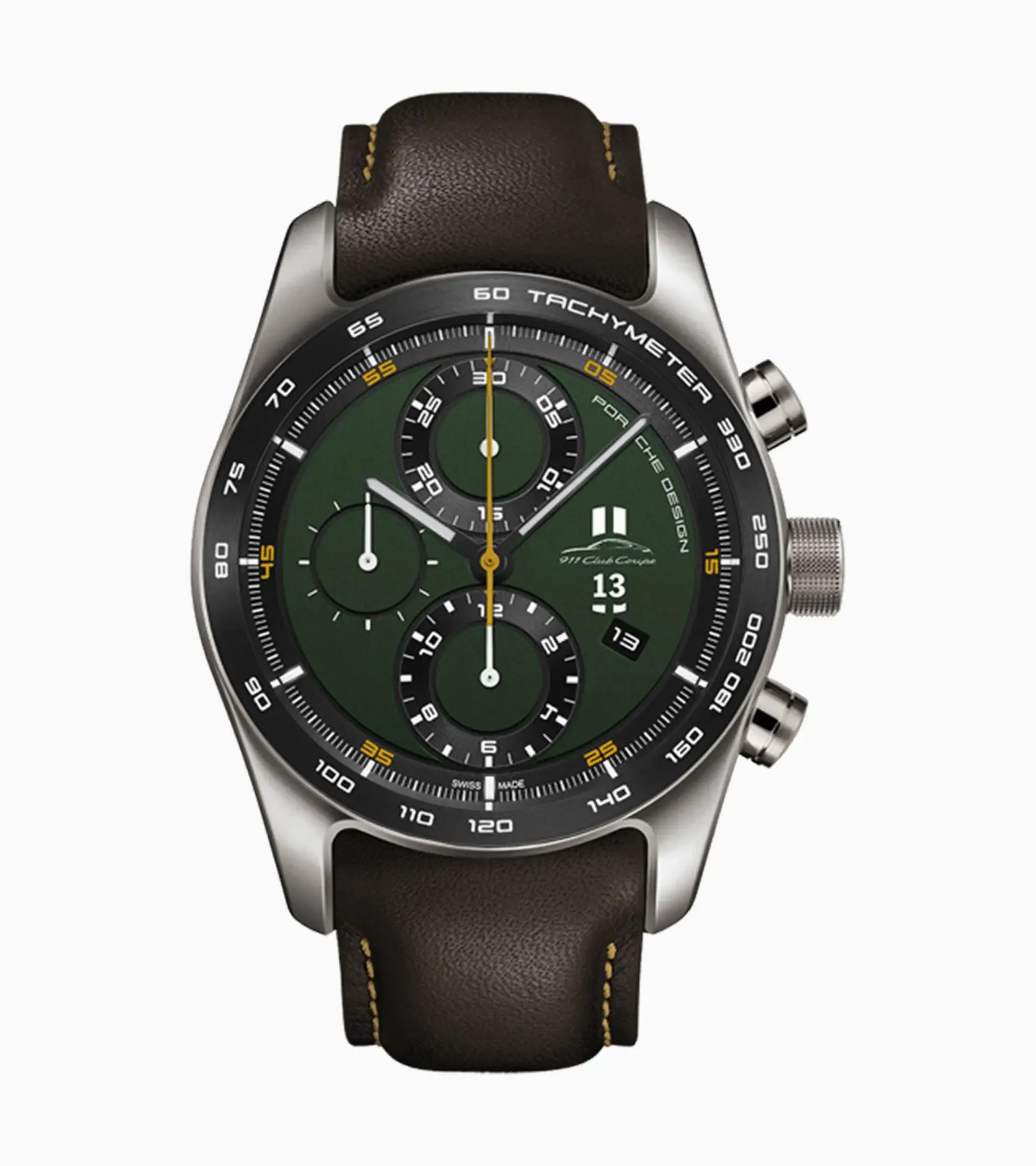In 2012 only 12 Club members worldwide had the opportunity to acquire the exclusive 911 Club Coupe honouring the first Porsche Clubs. Over the years the group has grown into an enthusiast community founding the 911 Club Coupe registry. Mutual friendship and strong fascination for the outstanding sports car are the bonds creating a unique spirit. Based on this common understanding, the idea of extending sportscar ownership experience to the wrist by creating a dedicated Chronograph matching with the car’s key features was born in 2017. Porsche Design, founded back in 1972 by Prof. F.A. Porsche, the legendary designer of the 911, and its exclusive engineering and production site, Porsche Design Timepieces AG in Solothurn, Switzerland, accepted the challenge to create a highly exclusive small series Chronograph to fulfill the Club members’ request. The Porsche Design Chronograph 911 Club Coupe. Brushed and polished titanium case. 7-layer anti-reflective coating. Hiqh quality, swiss mechanical movement (Calibre ETA Valjoux 7750), Porsche Design Icon. Sapphie case back. Brown calf leather strap, yellow stitching. Saphirglasboden. Manufactured by Porsche Design Timepieces AG, Switzerland. Case -Diameter: 42mm -Height: 14.62 mm -Material: Titanium, bezel black titanium carbide coating -Finishing: glass bead-blasted, brushed, polished -Crown: Screw-down -Glass: Sapphire crystal, convex, scratch-proof with sevenfold anti-glare properties on both sides -Case back: screw-down with tinted sapphire crystal -Water-restistant: up to 5 bar -Individual VIN Number engraving on the case back Dial -Green dial with Club logo print, minute, hour, small seconds hand at 9`clock, chronograph second hand, 30-minute counter at 12 o`clock, 12-hour counter at 6 o`clock, date window at 4 o`clock, tachymeter scale on the bezel. Strap: -brown calfskin, yellow stitching -changeable strap-system -folding clasp, glass bead-blasted Movement -Caliber: Swiss chronograph caliber ETA Valjoux 7750 -Rotor: Porsche Design Icon Rotor -Diameter: 30.00 mm -Height: 7.90 mm -Power reserve: 48 hours -Frequency: 28,800 per hour (4Hz) -Jewels: 25 Special Edition -Special Edition box with Edition booklet and individual engraving on the metal badge