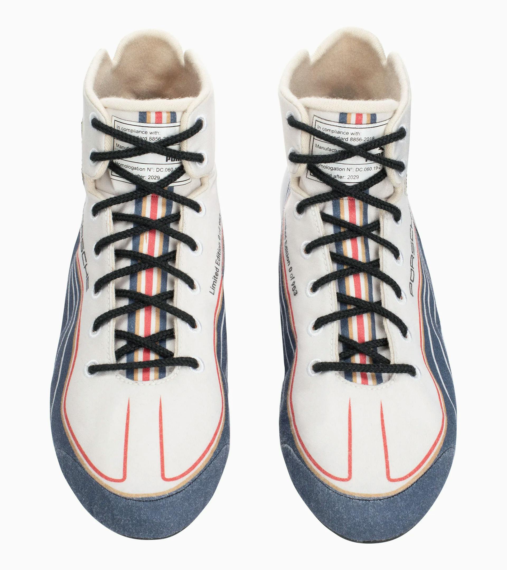 Esclusiva sneaker Porsche in collaborazione con PUMA. Realizzate in materiale resistente al fuoco certificato FIA, con suola sottile ed elemento stabilizzante in carbonio sul tallone.