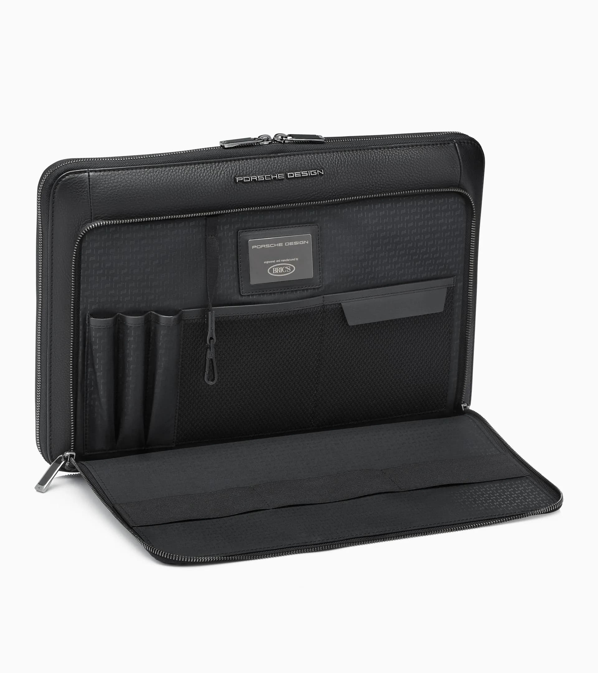 Esclusiva custodia per laptop Porsche Design in pelle di vitello goffrata per notebook fino a 15 pollici. Tasca frontale aggiuntiva con cerniera e organizer.