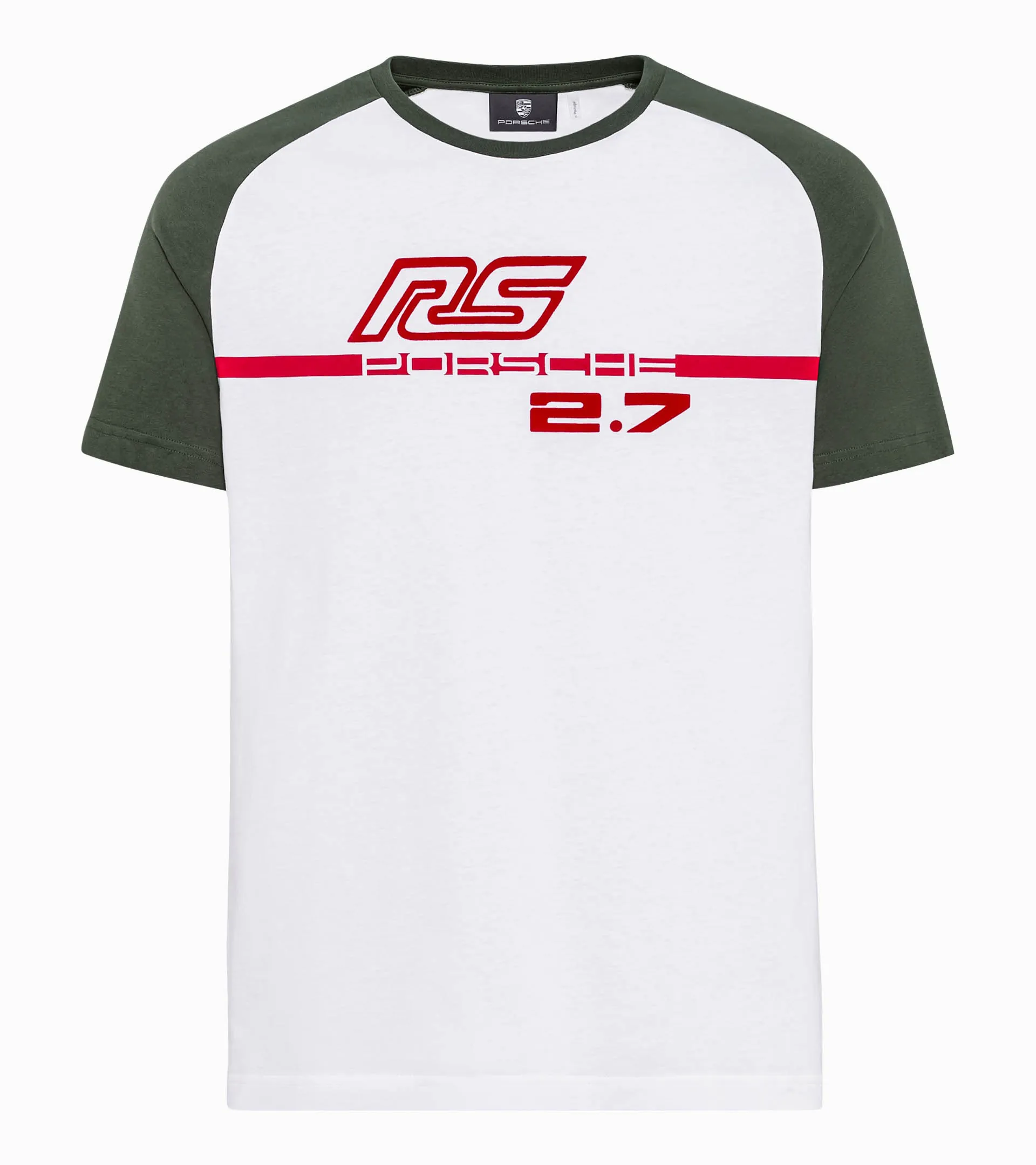 Un pezzo di storia Porsche per l'uso quotidiano: la maglietta casual a mezza manica con stampa RS 2.7 floccata sul petto sembra davvero fatta per esprimere la storica passione per Porsche.