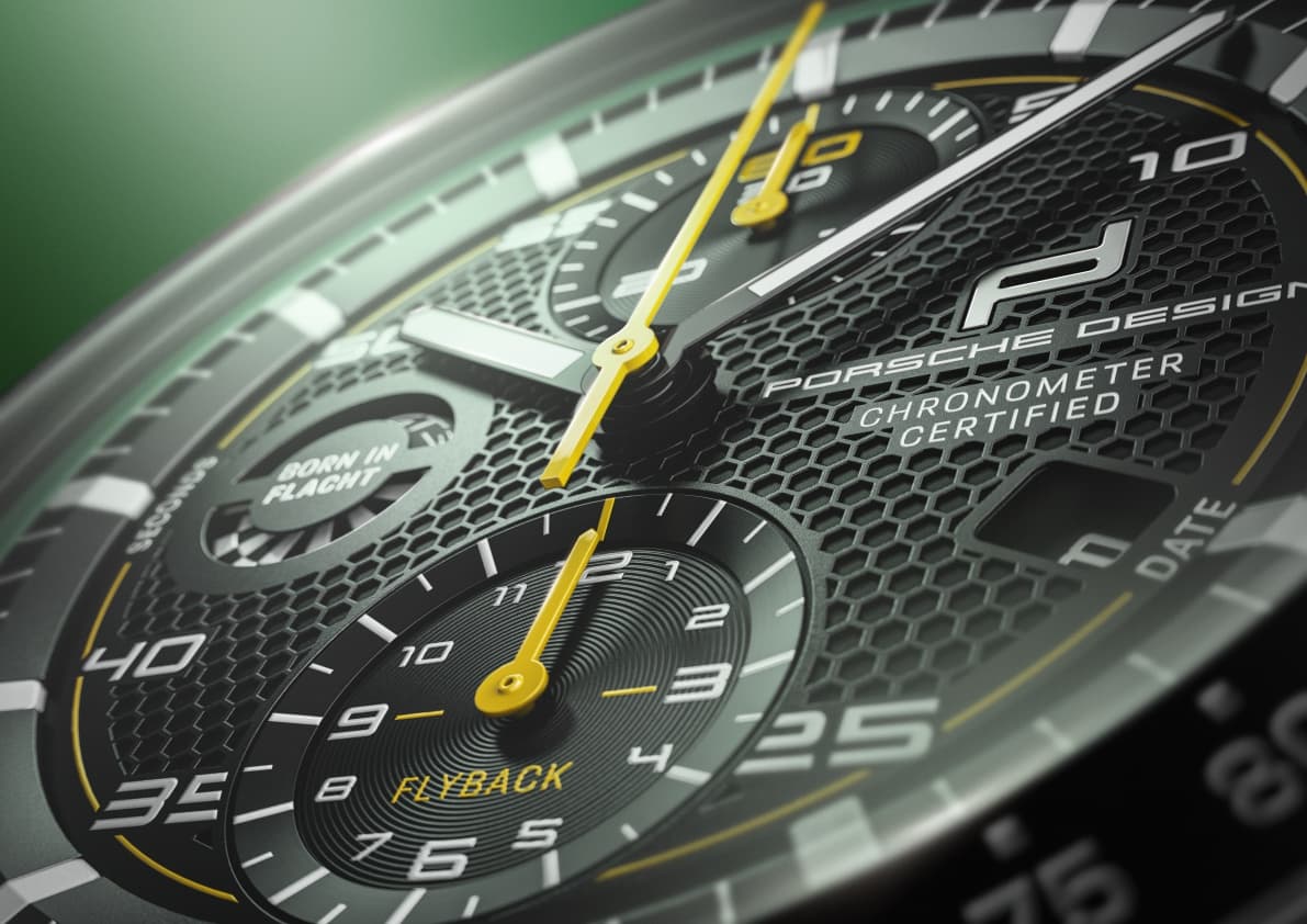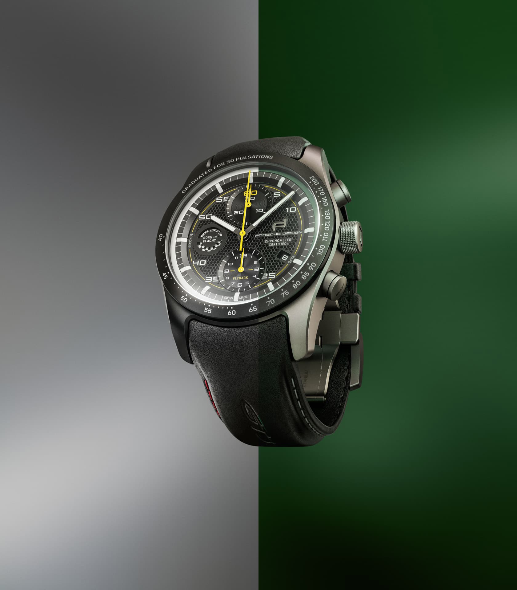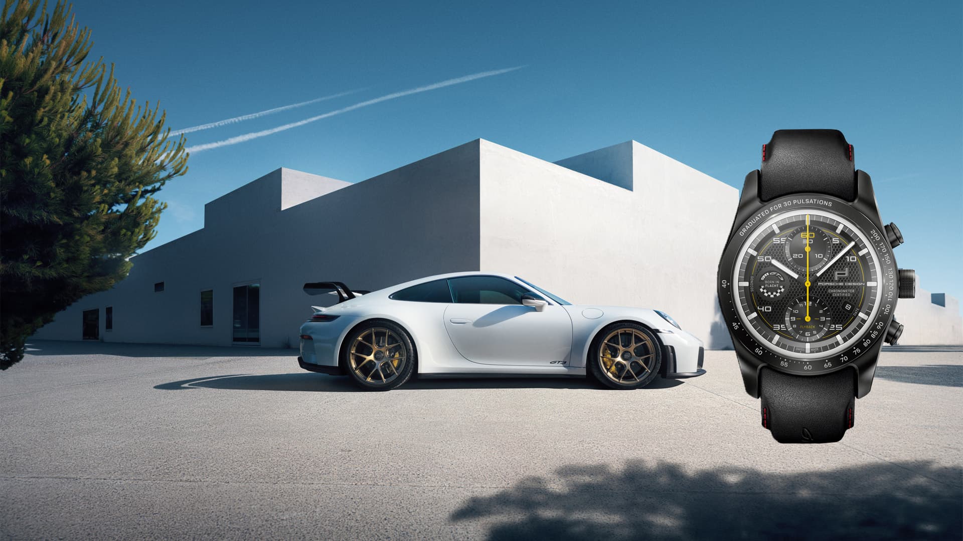 Il cronografo 911 GT3 misura il tempo e le emozioni: la lunetta con pulsometro, infatti, consente la misurazione meccanica del battito senza batteria. La lunetta con scala pulsometrica, tachimetrica o scala dei minuti è realizzata in titanio o carburo di titanio nero, così come la cassa, i pulsanti e la corona. L'incisione "Start/Stop" invoglia a far segnare il miglior tempo, mentre il pulsante "Reset" e la funzione flyback del calibro Porsche Design WERK 01.200 certificato COSC consentono ripartenze rapide.