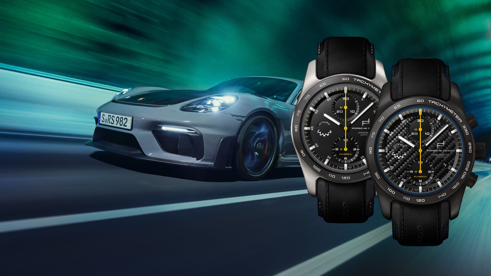 Nella 718 Cayman GT4 RS sono stati utilizzati componenti che, oltre a essere estremamente resistenti, sono anche leggeri. Lo stesso concetto di costruzione leggera con carattere performante si ritrova nel cronografo 718 Cayman GT4 RS con cassa in titanio. Il quadrante nero opaco, le lancette gialle dei secondi del cronografo e il contatore del cronografo sono ispirati al contagiri della vettura sportiva GT. L’anello colorato è mantenuto nella tonalità grigio artico. Il cinturino, che porta stampato “GT4 RS”, è realizzato con la pelle originale degli interni Porsche e combinato con lo sportivo Race-Tex.