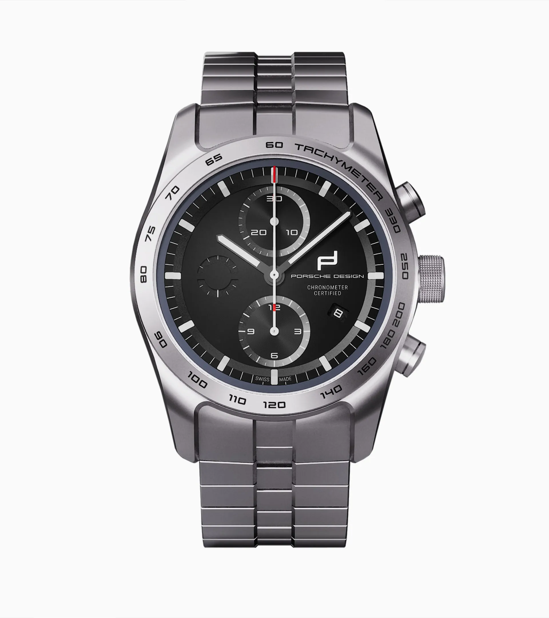 Bezel: natural titanium, tachymeterCase and clasp: natural titaniumColoured ring on dial: Dark Night BlueDial: BlackHands: 'Performance', Matt White with Red tipMetal strap: natural titanium, folding clasp with fine adjustmentModel year: 911 (992.2), from 2024Movement: Porsche Design Chronograph, Werk 01.100 movementPorsche Design custom-built ChronographPorsche Design icon rotor