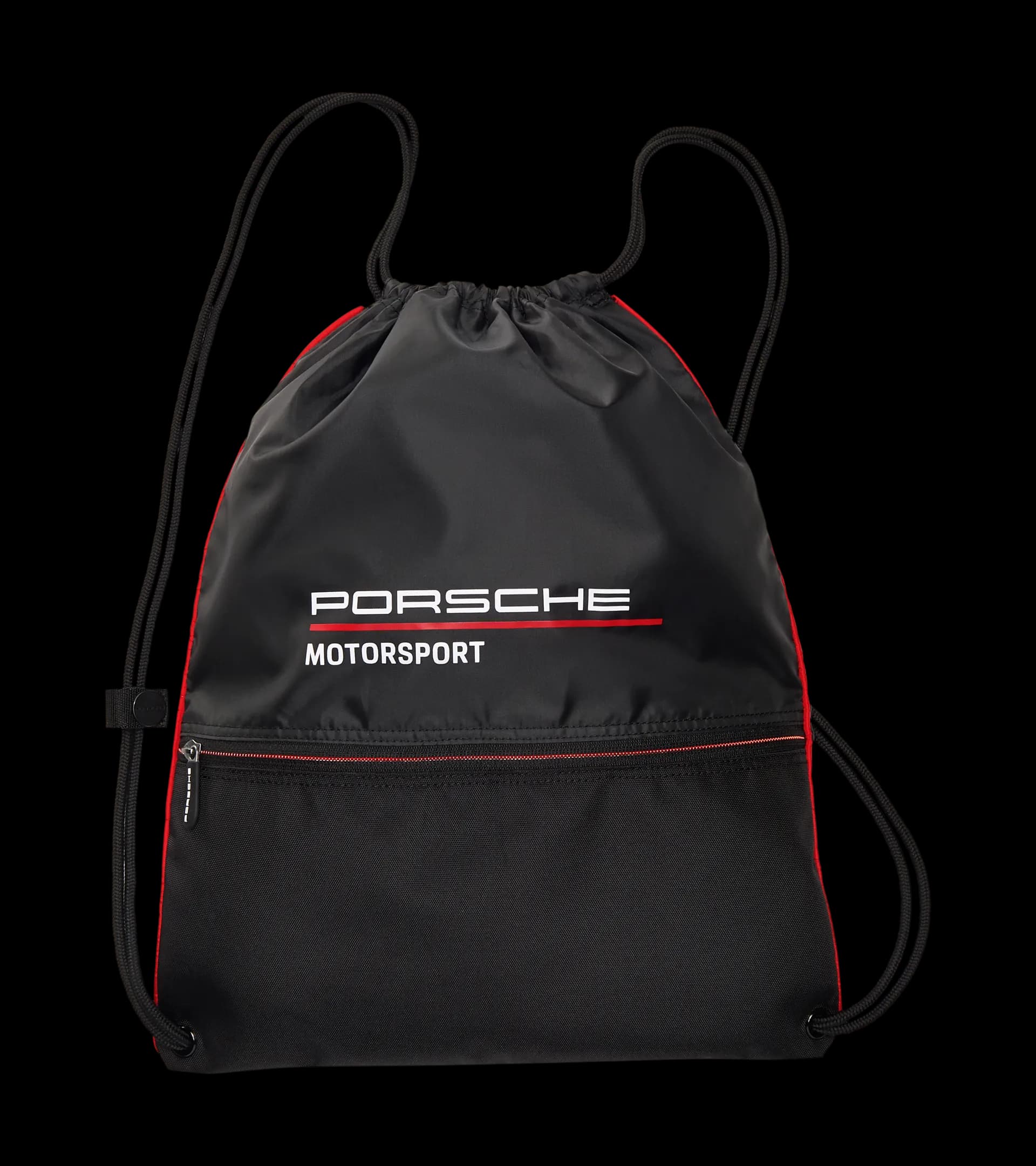 Leichter Rucksack im klassischen Turnbeutel-Design mit Reißverschlusstasche und „PORSCHE MOTORSPORT“ Signet.