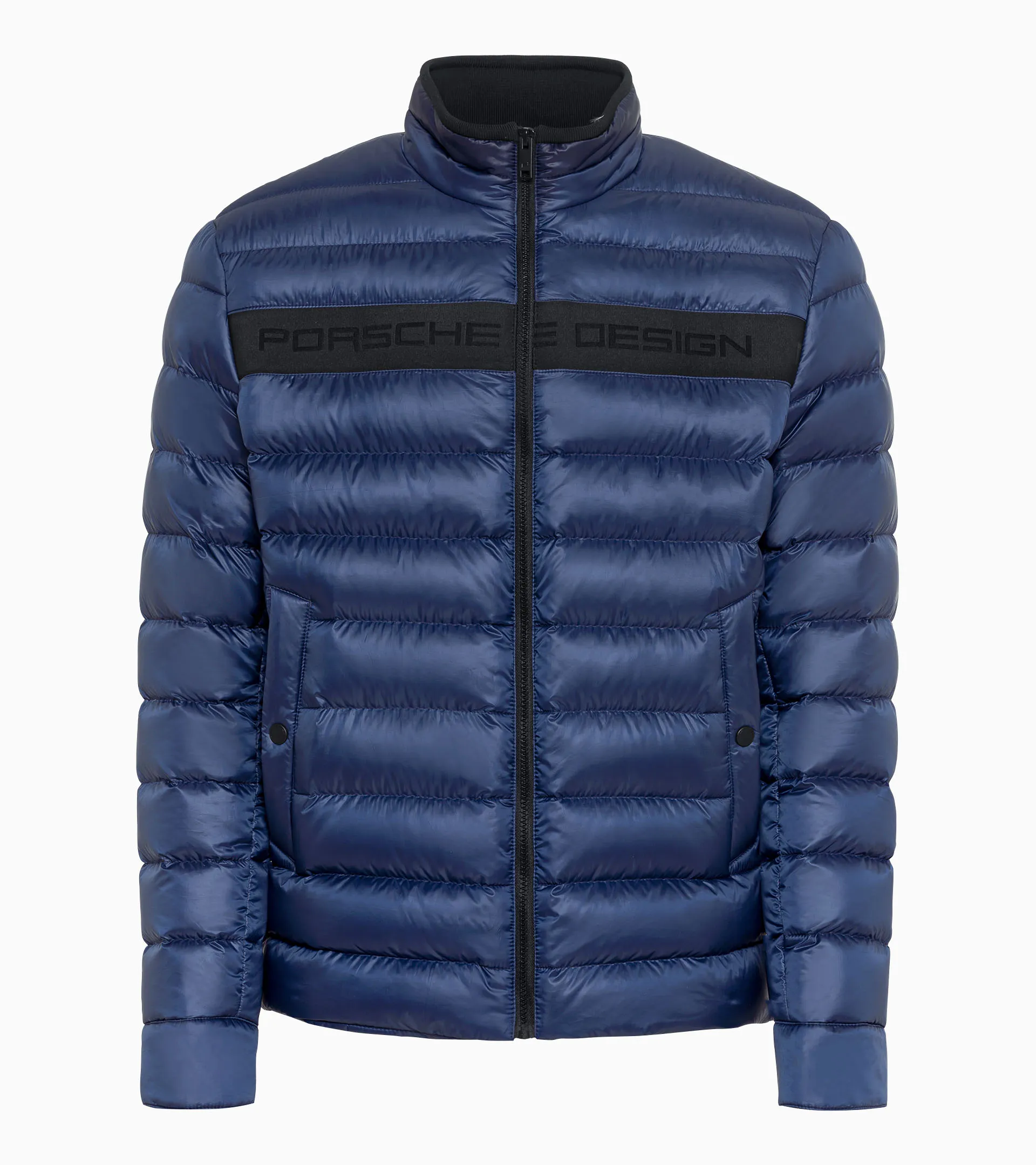Leicht wie eine Feder – ganz ohne Federn: Die gerade geschnittene Jacke mit daunenfreier Füllung ist perfekt geeignet für die Übergangszeit. Die zwei Taschen auf Hüfthöhe sind mit Druckknöpfen schließbar, die Taschen im Inneren mit Reißverschlüssen. Porsche-typisch raffinierte Details sind der Strick auf der Innenseite des Stehkragens und das Porsche Design-Tape auf der Front der Jacke.