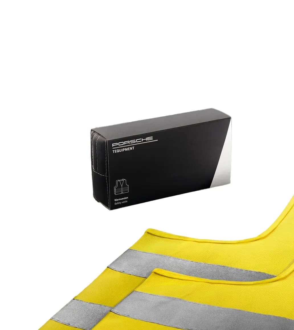 Zwei Warnwesten in auffälligem Gelb mit reflektierenden Streifen in kompakter Verpackungsgröße. Zur Unterbringung im Handschuhfach oder in den Ablagefächern des Fahrzeugs.
