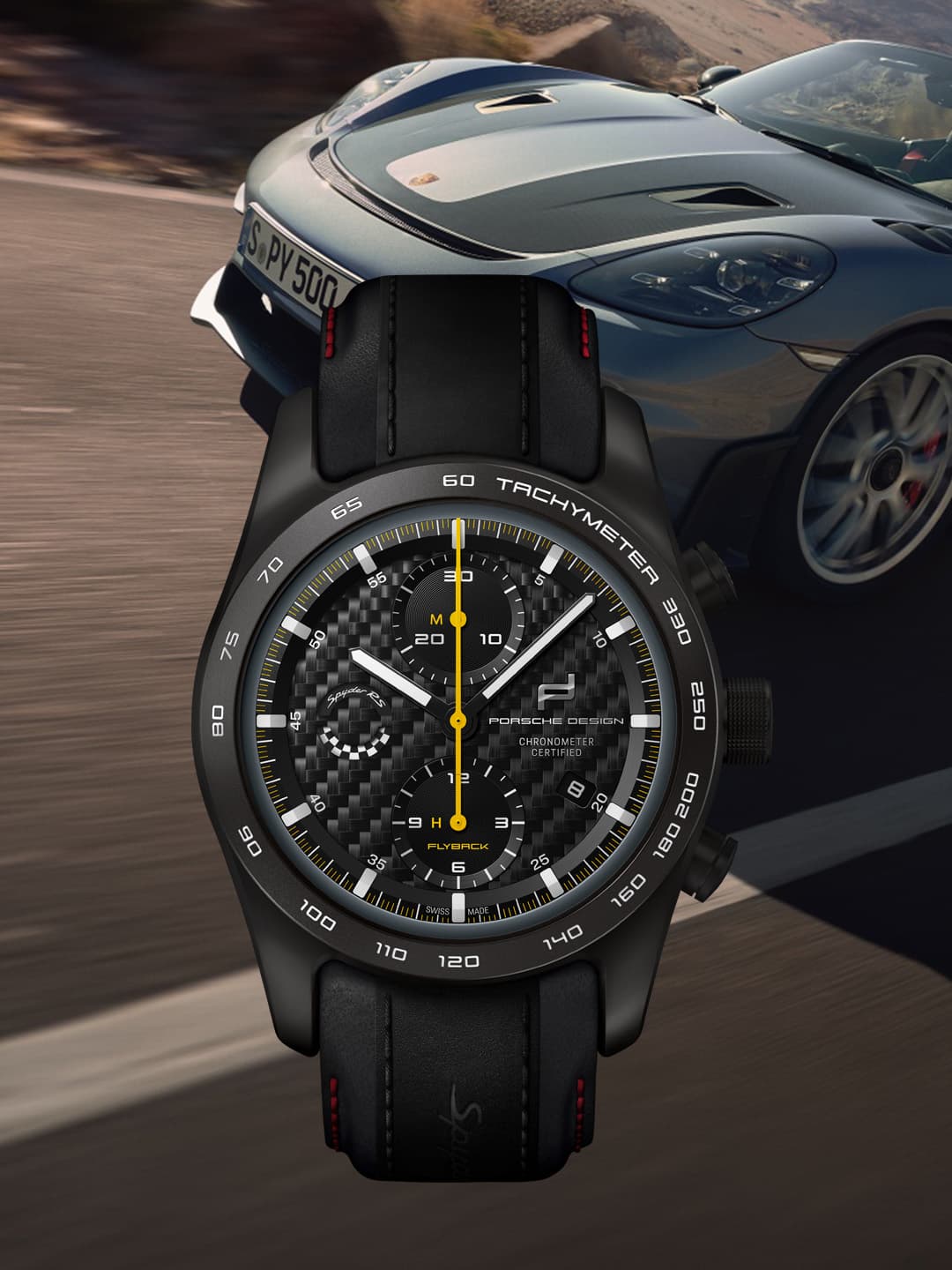 Les propriétaires de modèles GT, de modèles spéciaux ou de modèles Exclusive Manufaktur peuvent faire réaliser en exclusivité un Chronographe Porsche Design personnel adapté à leur propre véhicule. Les caractéristiques distinctives du véhicule Porsche concerné sont transposées dans le design, les matériaux et la couleur du Chronographe. Le nombre de montres est limité à la quantité maximale de véhicules produits. Seuls les propriétairesde ces voitures ont la possibilité d’acquérir ces montres assemblées au sein de la manufacture Porsche, sur commande des clients.