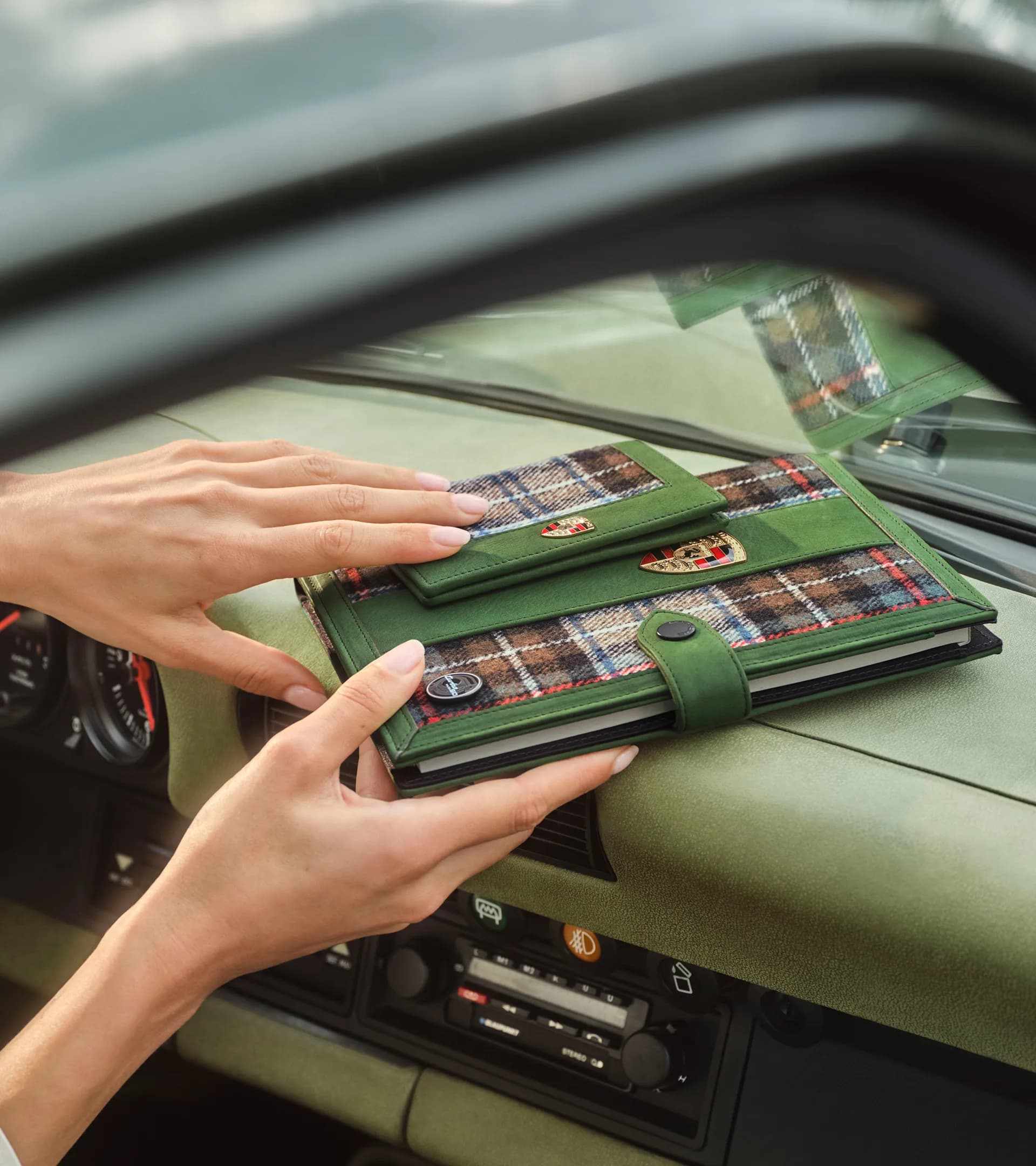 50 Years 911 Turbo: The '50 Years 911 Turbo' limited-edition document folder from Porsche Classic is inspired by the famous tartan cloth seat pattern from the interior of the 911 Turbo, which was given to Ferry Porsche to mark his 67th birthday. High-quality Green leather, a reduced 911 G crest and a Black magnetic closure with Porsche lettering come together to give the folder a stylish finish. The '50 Years' anniversary badge is located on the lower right edge.