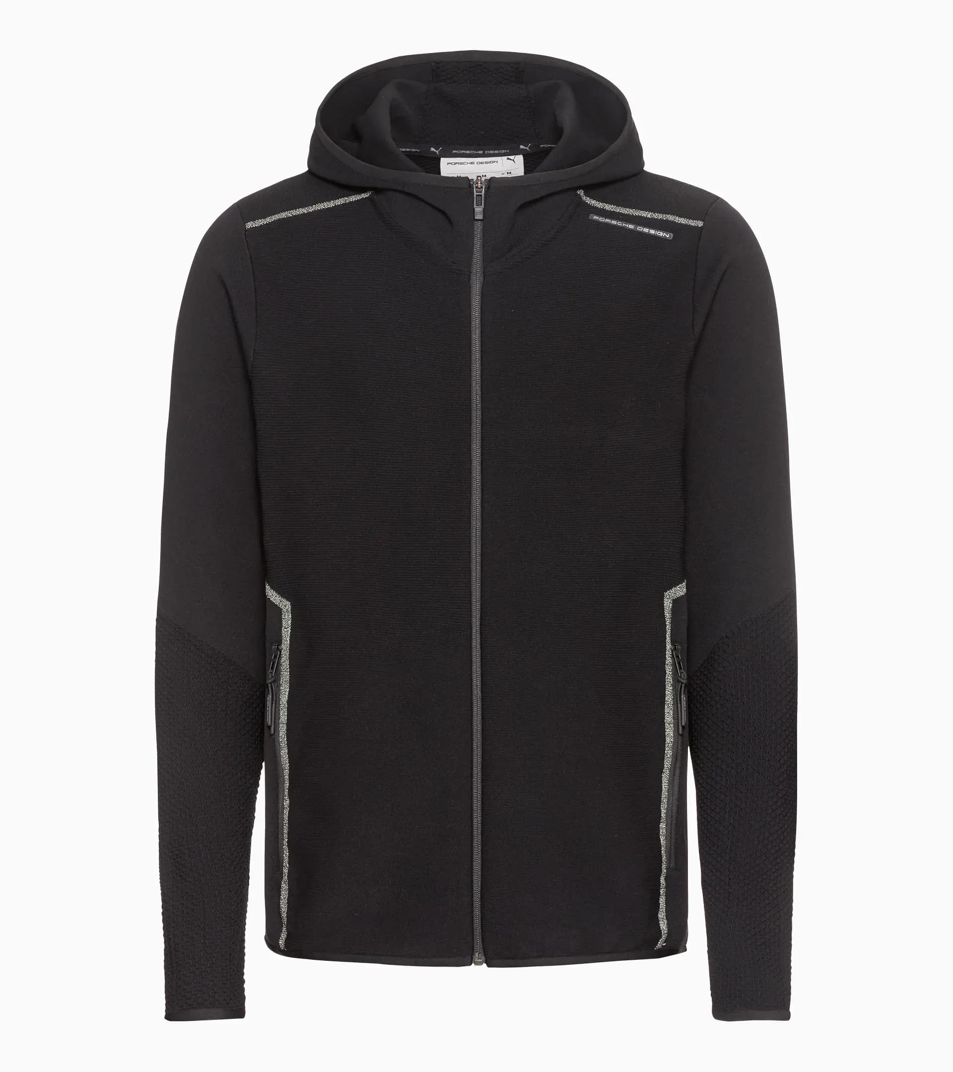The Porsche Design EvoKNIT® midlayer jacket brings together a functional sports jacket and an exclusive statement design. Its high-quality knit technology delivers a graphic 3D structure and instantly proves its top visual performance. Elastic cuffs on the sleeves, hem and hood brim ensure great comfort and freedom of movement. The zip pockets with reflective knitted details and the individually designed Porsche Design zip buttons add exclusive details.
