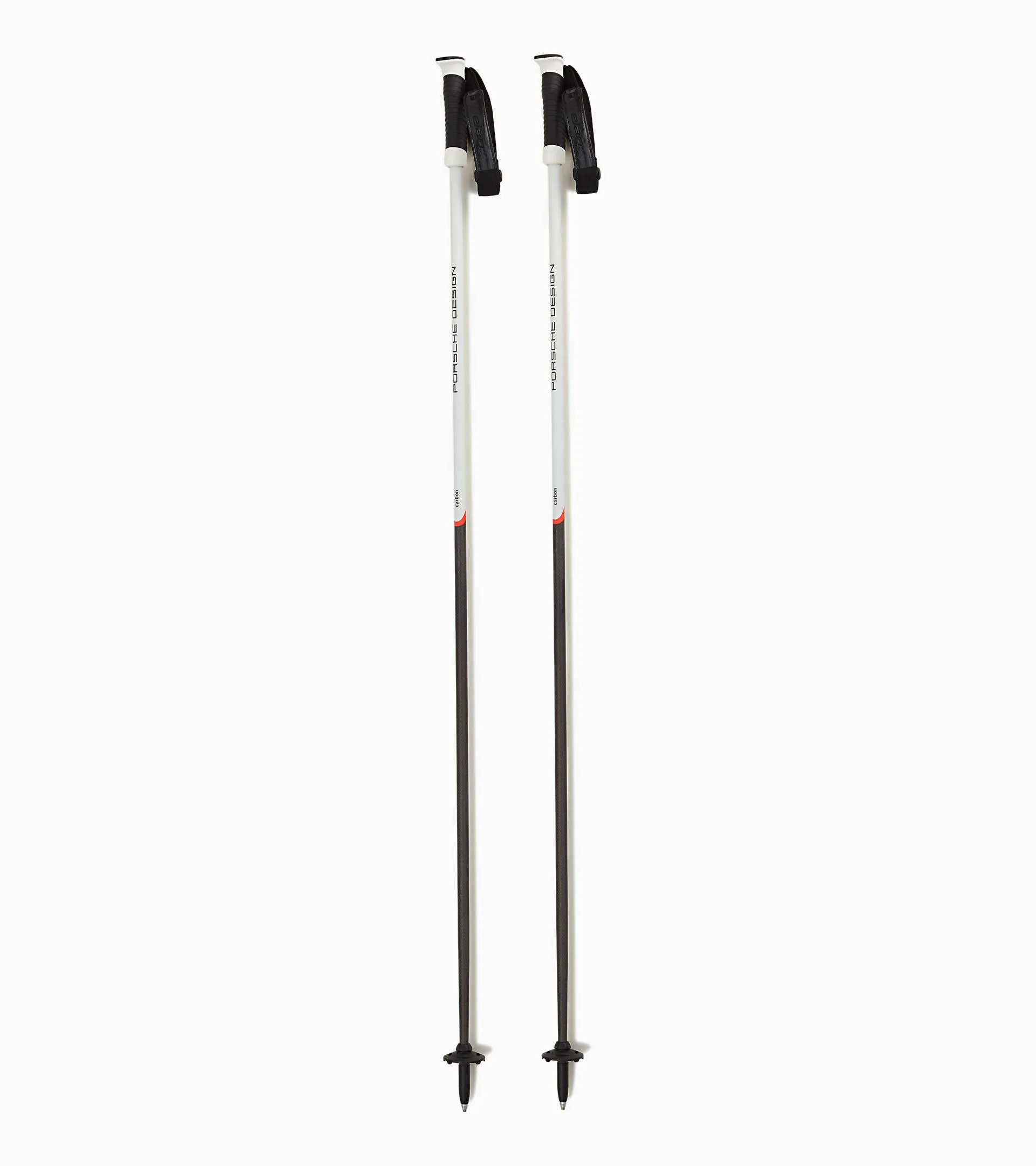 The ski poles that go with the Porsche Design Elan Amphibio 3.0 and Porsche Design Elan Ace: the Porsche Design Elan Ski Poles. The lightweight alpine ski poles were developed in the Alps and designed from a selection of high quality carbon. Combined with a very comfortable Elan Bulwark bi-component grip, the poles' hybrid design provides efficiency, reduced weight, comfort and stability. The adjustable velcro closure is perfectly tailored to the user, offering increased fit accuracy. Finished with a soft touch material, it is the perfect link between the skier and the poles all day long. The dynamic Ski Poles have a diameter of 14 mm, which makes them lighter, but still extra strong. The carbide tip provides precise setting of the poles and optimal grip in any terrain. The Porsche Design ski poles in a black and white color combination with red color accent perfectly match the two new Porsche Design Elan ski models of the winter season 2021/22 and are available in four sizes 115, 120, 125 and 130 cm.