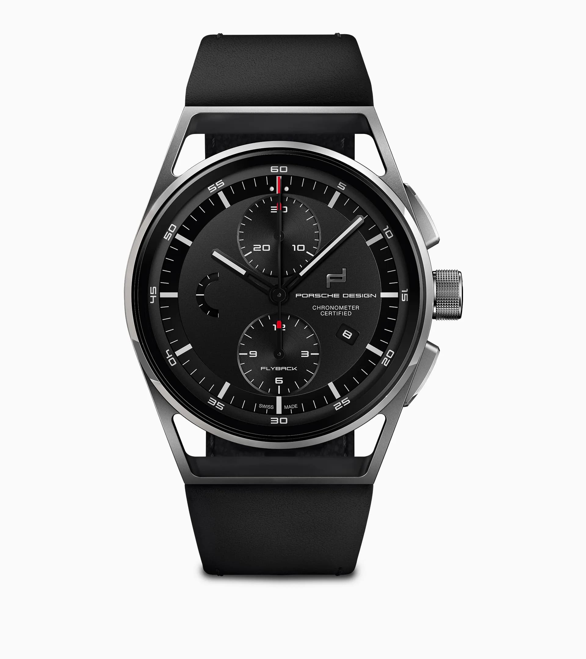 La sensation d'une voiture de sport au poignet. Précision sur simple pression d'un bouton. Porsche Design a développé le modèle 1919 Chronotimer Flyback, dérivé de la Porsche 911. De par sa fonctionnalité ultime et son design clair, il n'a rien à envier à son modèle. Entraîné par le premier calibre de chronographe Porsche Design, WERK 01.200 avec fonction Flyback, le chronographe certifié COSC mesure sans effort les unités de temps successives. Le lancement, l'arrêt et la remise à zéro s'effectuent en une seule opération. Pour des performances maximales, tous les modèles 1919 Chronotimer Flyback sont fabriqués en titane, un matériau extrêmement léger et durable, incontournable depuis des années dans la construction automobile. Le bracelet, en cuir véritable pour véhicule Porsche, montre également son lien de parenté avec la voiture de sport.L'ensemble de la collection 1919 illustre de manière éblouissante le langage esthétique intemporel et réduit à l'essentiel du professeur F. A. Porsche : puriste et fonctionnel, sans fioritures ni compromis. Le verre saphir à revêtement antireflet septuple protège le cadran, est résistant aux rayures et durable et assure une lisibilité optimale. Le fond du boîtier avec ouverture en verre saphir offre une expérience visuelle parfaite avec une vue sur le calibre Porsche Design et le rotor avec icône Porsche Design. Une technologie que l'on peut observer.