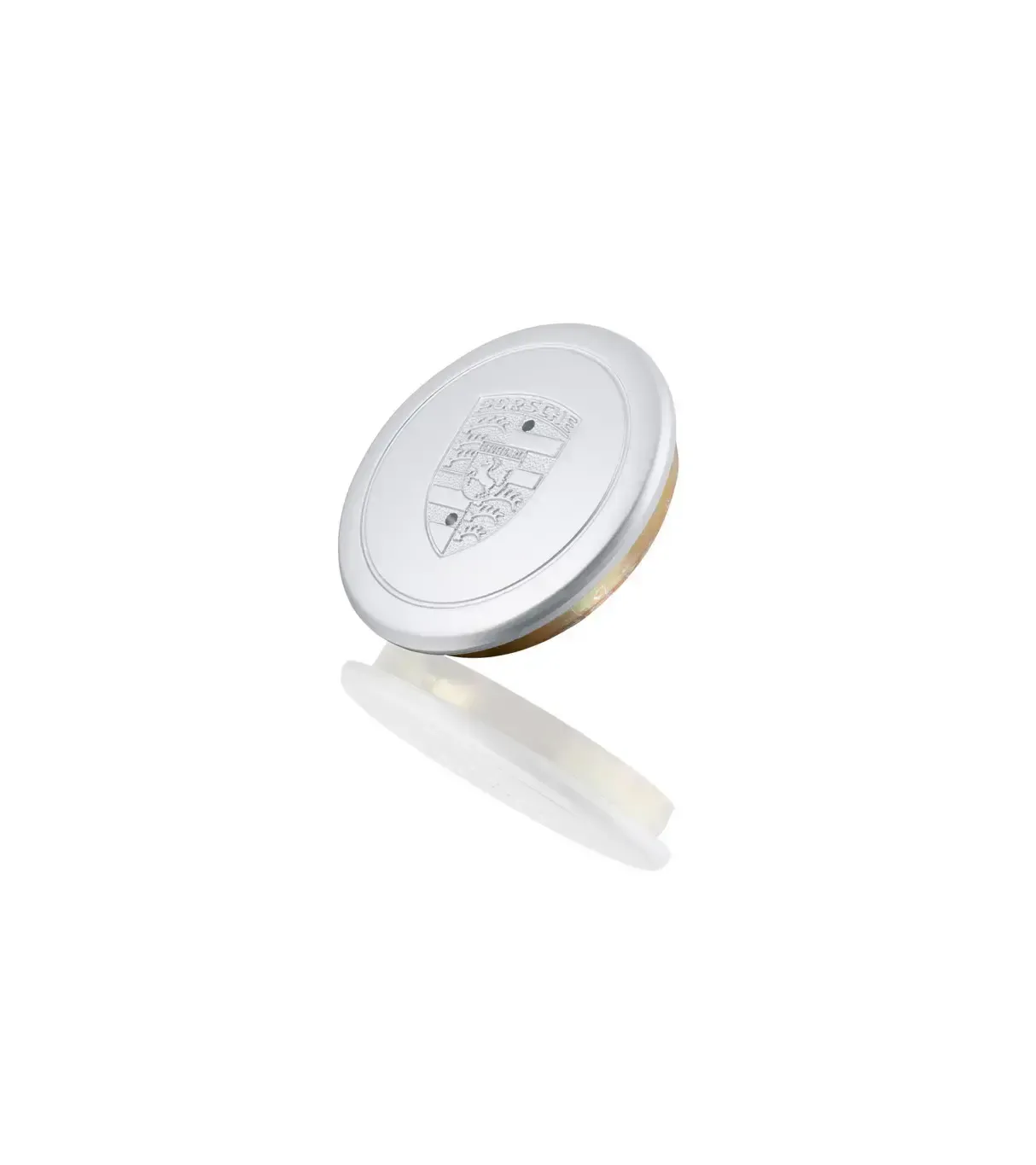 Enjoliveur de roue pour jante de diamètre intérieur 71 mm en argenté avec écusson Porsche embossé, pour Porsche 911 des années-modèles 1970 à 1983.