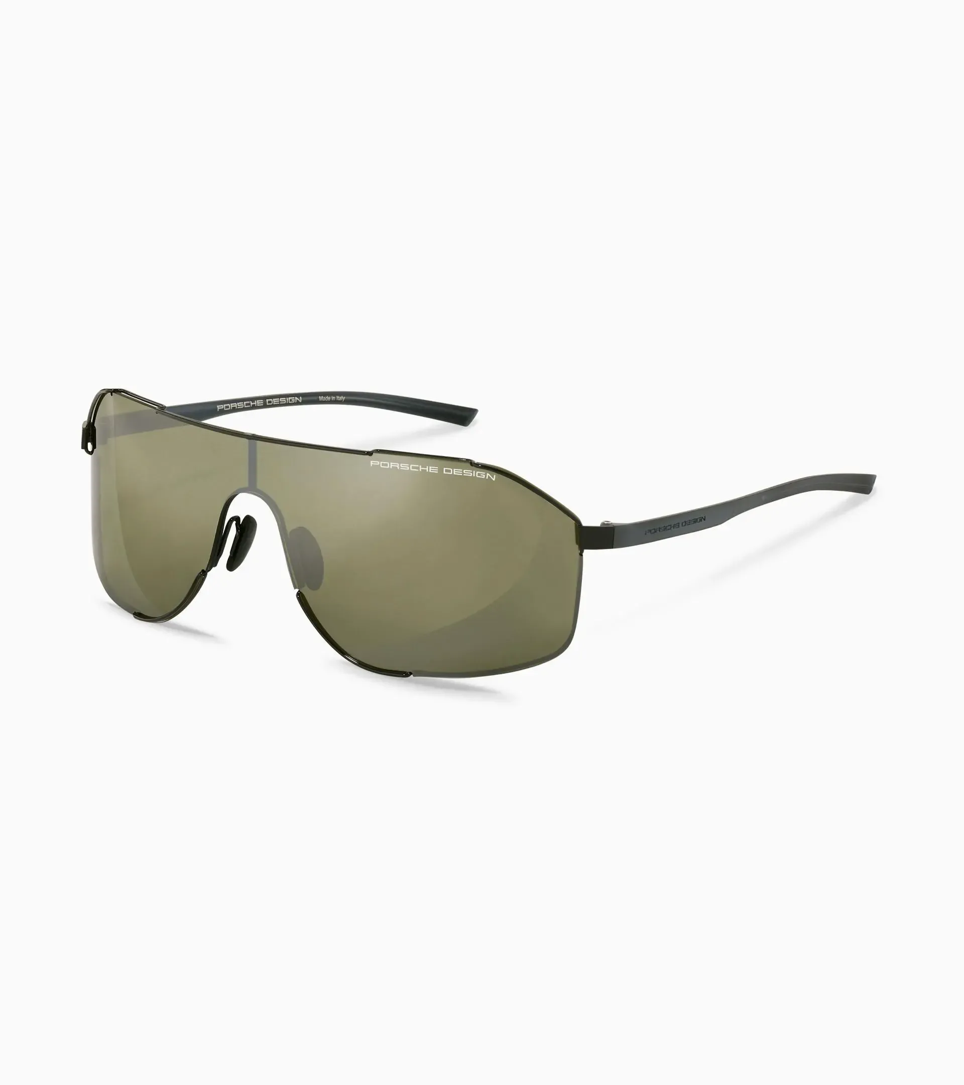 Lunettes de soleil bouclier modernes pour hommes de Porsche Design dans un style sportif. Monture exclusive en fil à ressort en acier inoxydable et branches légères en matière plastique.