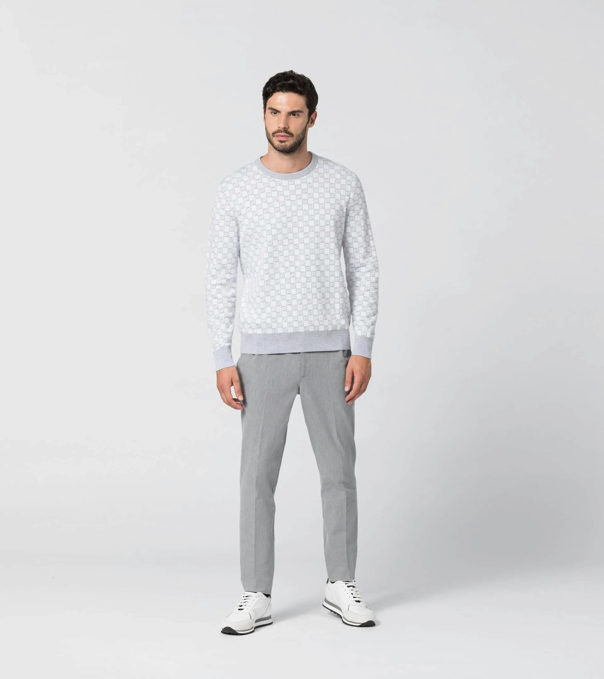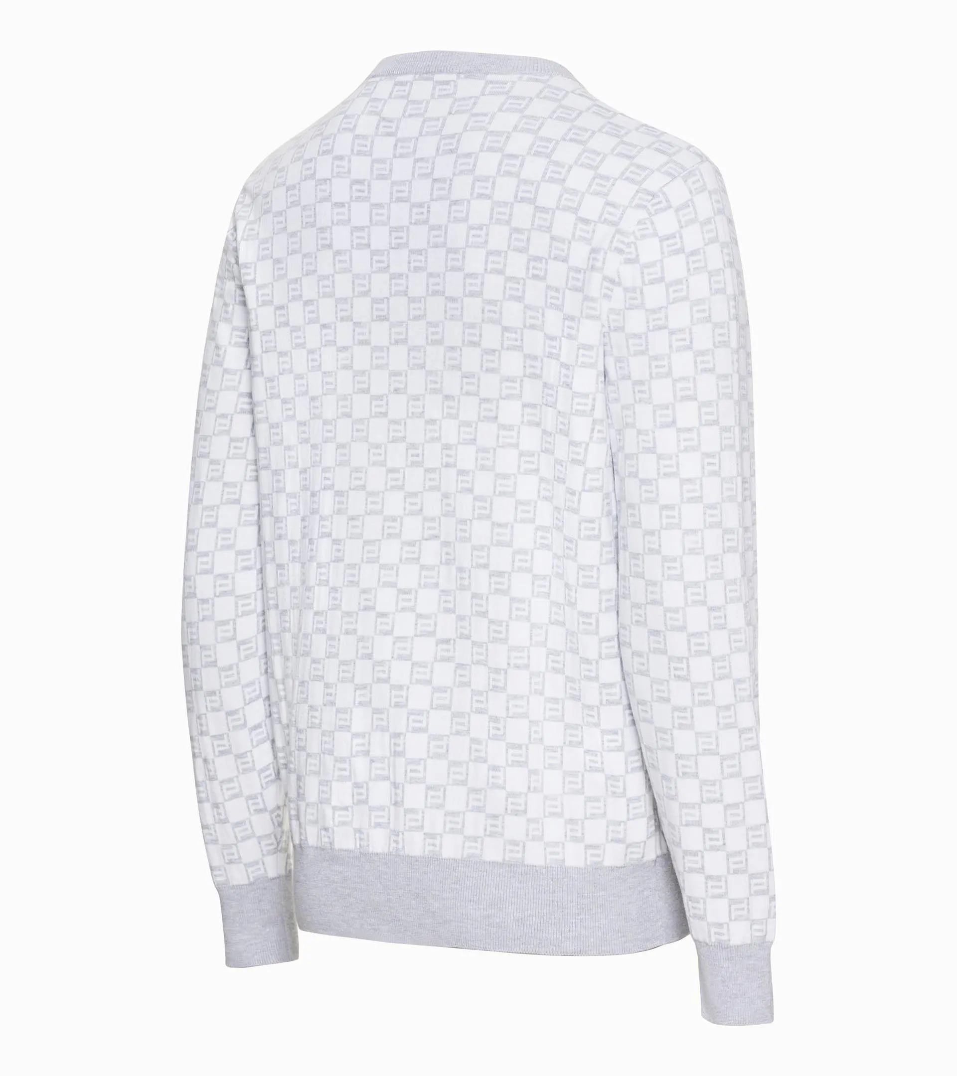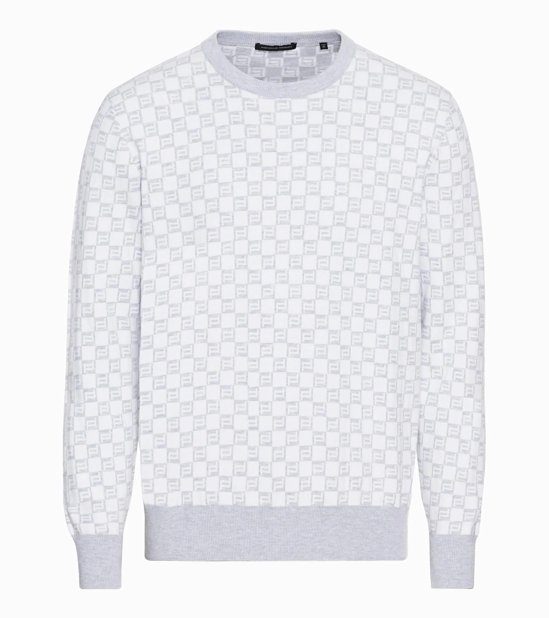 Pull-over de marque pour hommes en tricot jacquard Porsche Design en coton. Le pull-over à carreaux de créateur exclusif avec une encolure ronde affiche une élégance sportive.
