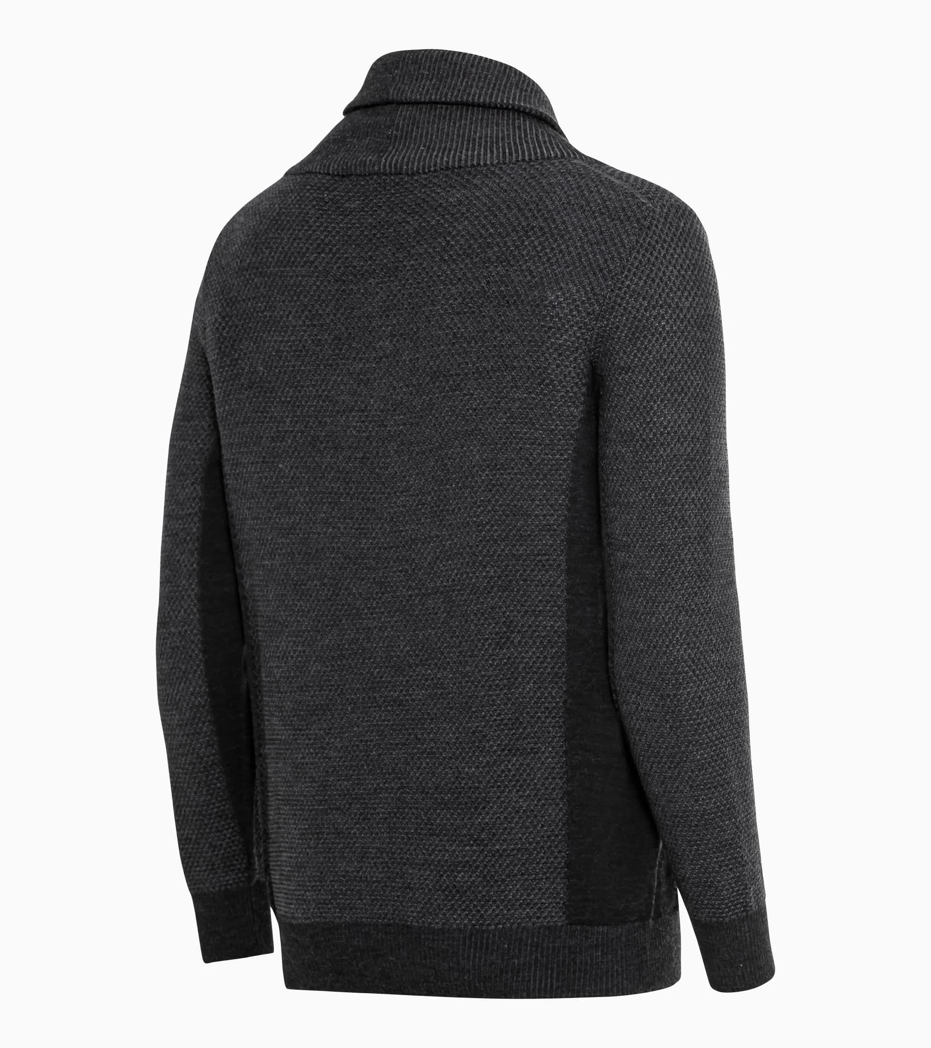 Dynamisme moderne et confort intemporel : le luxueux Porsche Design Shawl Collar Sweater réunit sans peine d’apparents contraires dans un design élégant. Le pull tricoté en laine mérinos moelleuse est fabriqué en Italie en petite quantité. Un col châle à la fois chaud et élégant confère à ce pull pour homme à la coupe droite un look décontracté. La coupe prononcée associe un motif gaufré personnalisé et des parties contrastantes en maille lisse ou côtelée, alliant ainsi sportivité et modernité. Des boutons Porsche Design en caoutchouc et une icône Porsche Design métallique cousue à la main sur l’ourlet apportent la touche finale exclusive à ce pull en mérinos.