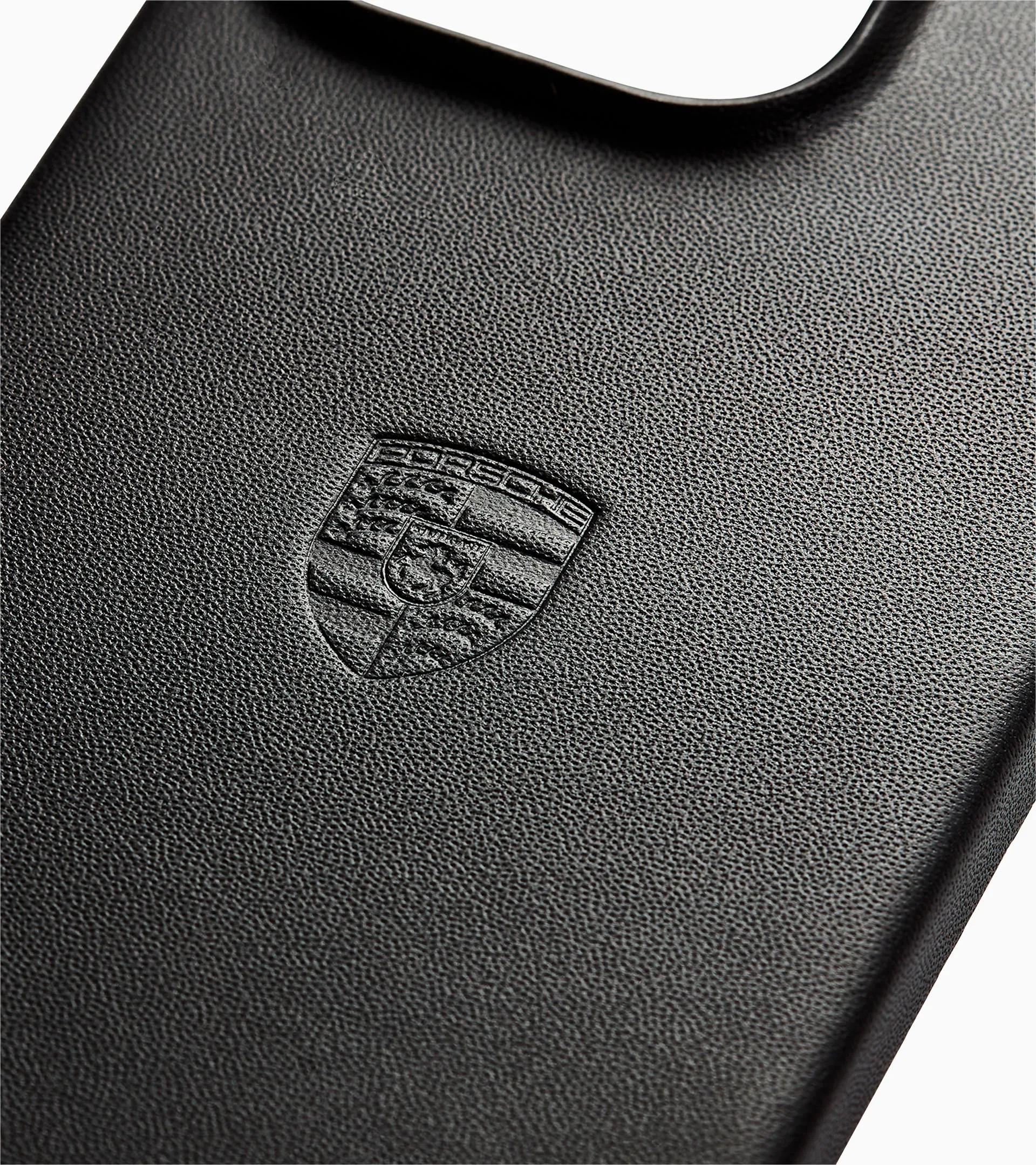 Coque exclusive Porsche en cuir pour l'iPhone 16 Pro avec écusson Porsche embossé et inscription « Taycan ».