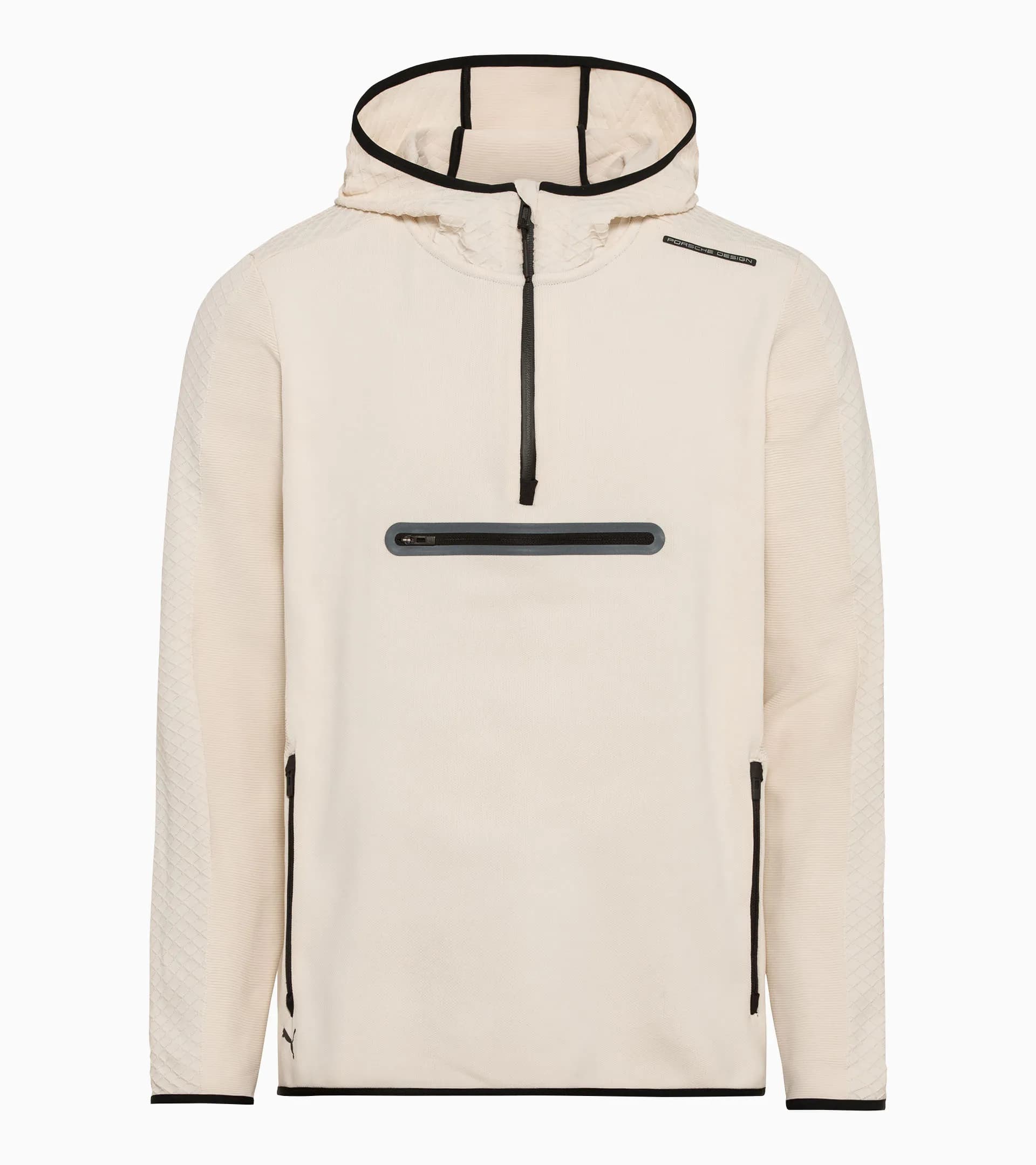 Het EvoKNIT® midlayerjack is de samensmelting van een functioneel sportjack en een exclusief statement-design. Dat er in elke vezel Porsche-DNA zit, wordt onder meer benadrukt door drie verschillende weefpatronen, de capuchonconstructie met 3 panelen en de hoogwaardige afwerking van het jack.De naadloze kangoeroezak, de borstzak met ritssluiting, de opstaande kraag in de capuchon en het bungeekoord met Porsche Design-Branding zorgen voor visuele accenten. De elastische randen aan de capuchon, mouwen en zoom zorgen voor een uitstekend draagcomfort. De centrale 1/4-rits maakt het stijlvolle ontwerp compleet.