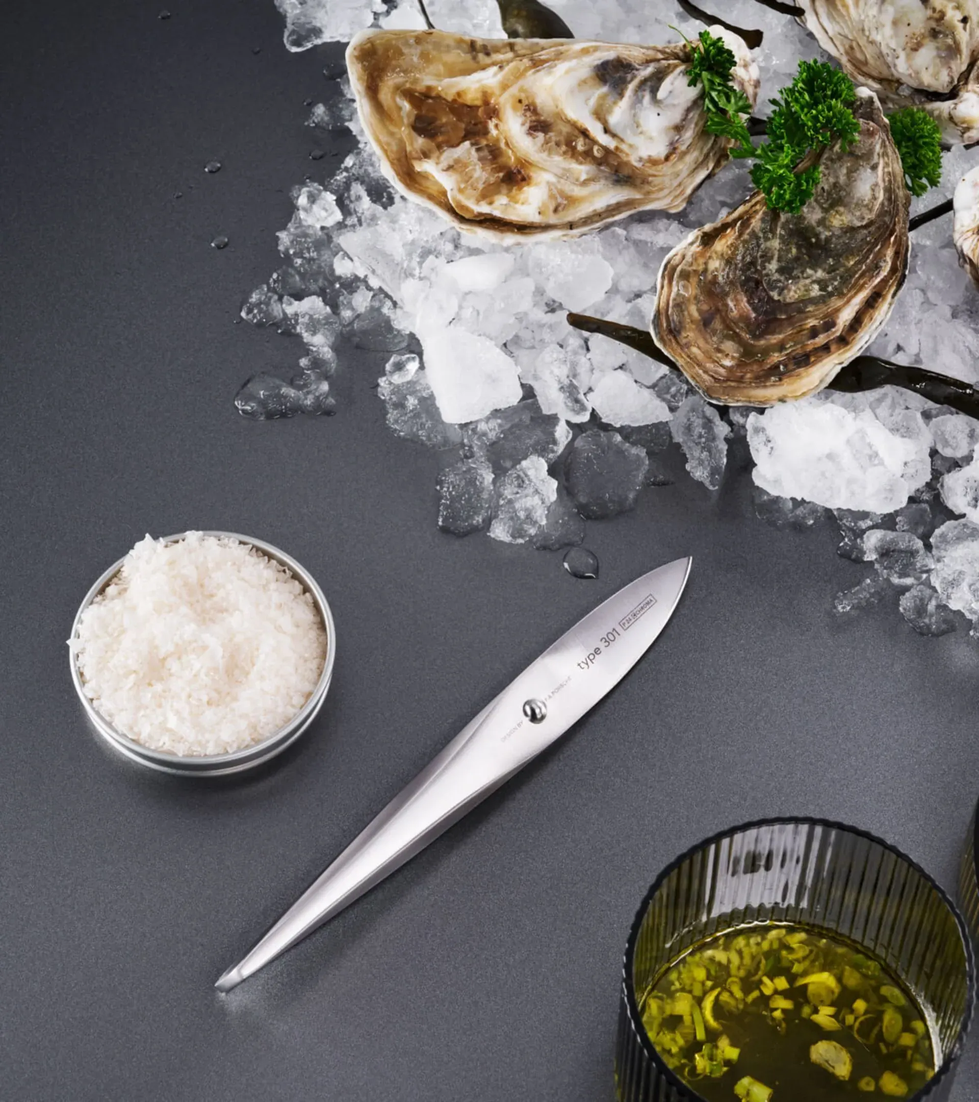 Delicaat vormgegeven oestermes van Porsche Design gemaakt van roestvrij staal.