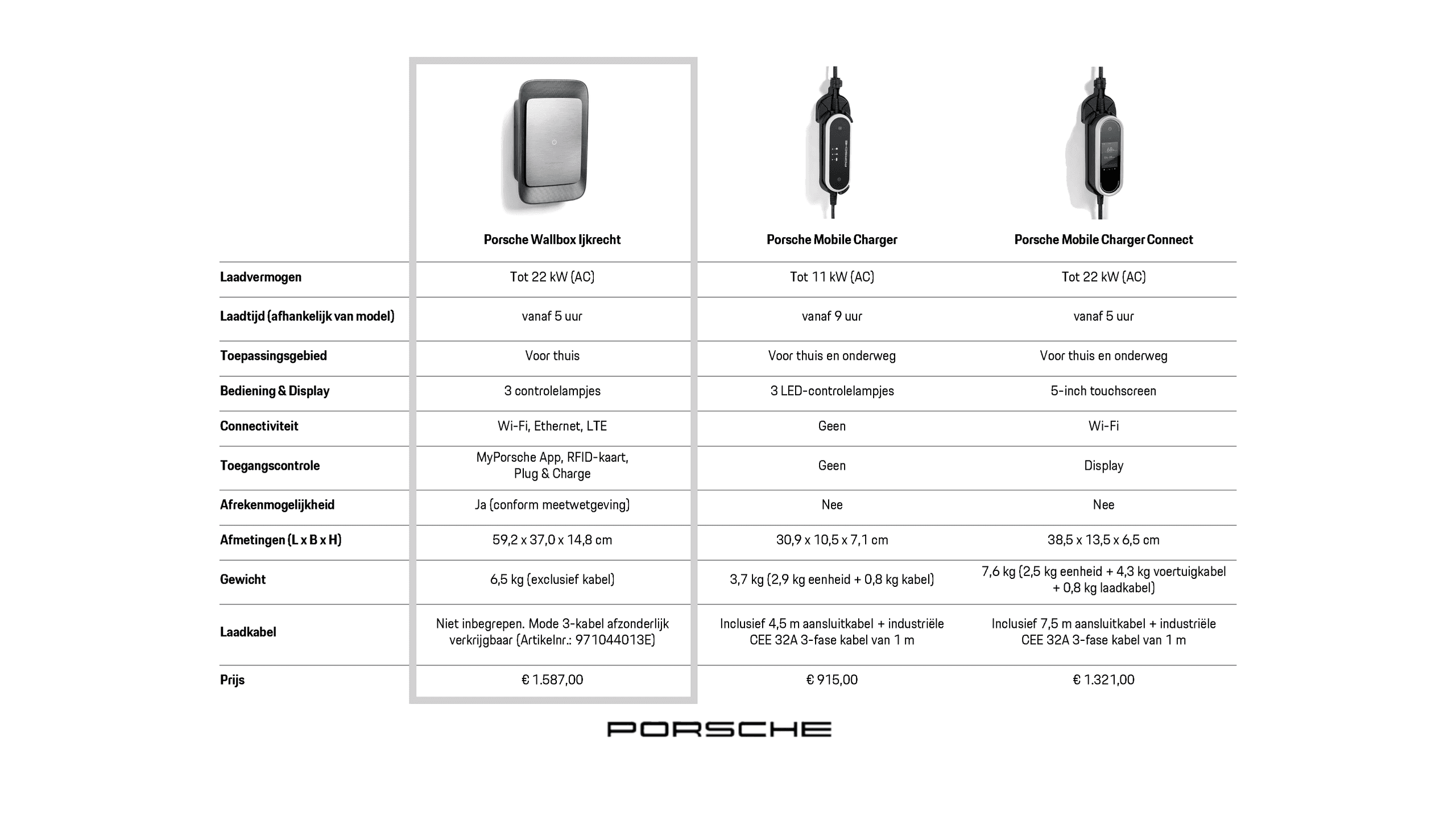 1Let op: De Porsche laadapparatuur is alleen geschikt voor gebruik bij voertuigen die voldoen aan de algemeen geldende normen en richtlijnen voor elektrische voertuigen. Compatibiliteit is alleen gegarandeerd voor elektrische voertuigen met een type 2-stekker. De oplaadtijd is afhankelijk van het voertuigmodel, de uitrusting van het voertuig en het land waarin wordt opgeladen.