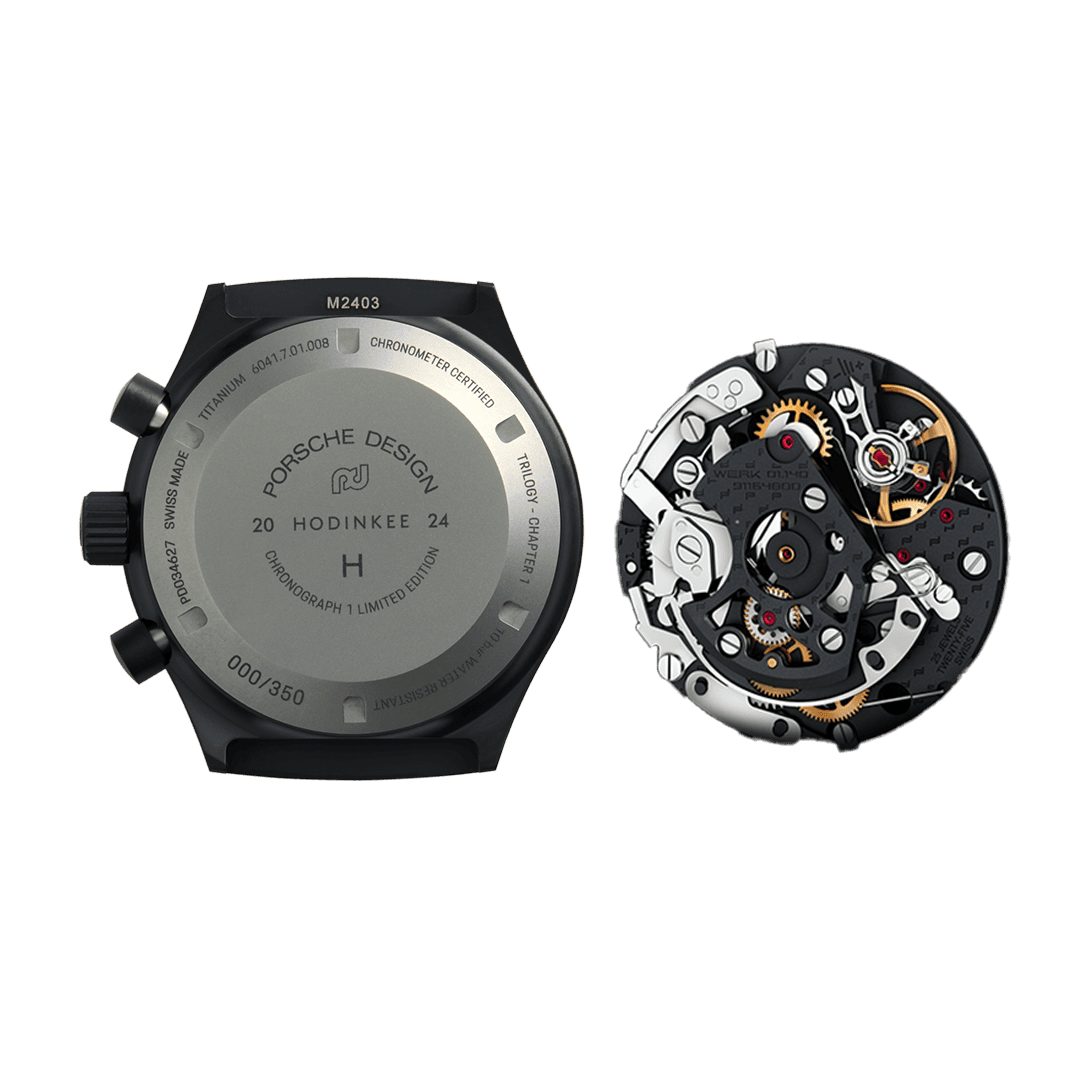 The heart of the Chronograph 1 – Hodinkee 2024 Edition is the Porsche Design calibre WERK 01.140, manufactured in the Porsche watch factory in Switzerland, with COSC certification.