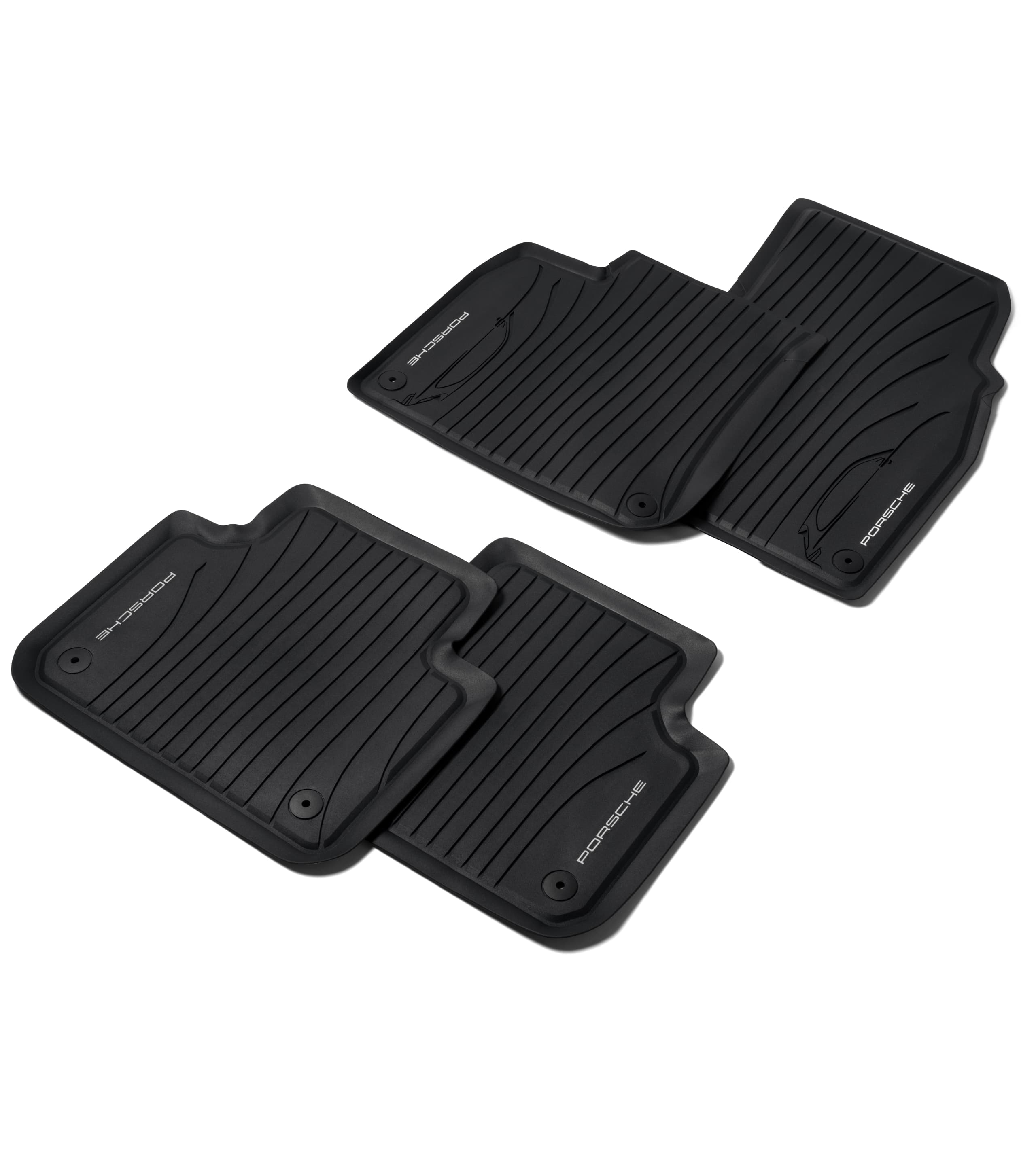 Firedelt sett i attraktiv design med kjøretøysilhuett og "PORSCHE"-tekst. Sklisikker og vanntett med hevet kant som går helt rundt.