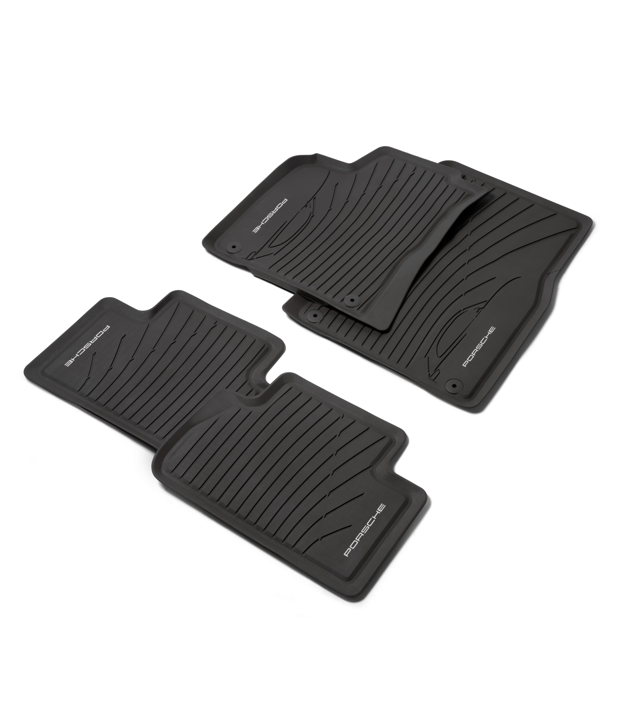 Firedelt sett i attraktiv design med kjøretøysilhuett og "PORSCHE"-tekst. Sklisikker og vanntett med hevet kant som går helt rundt.