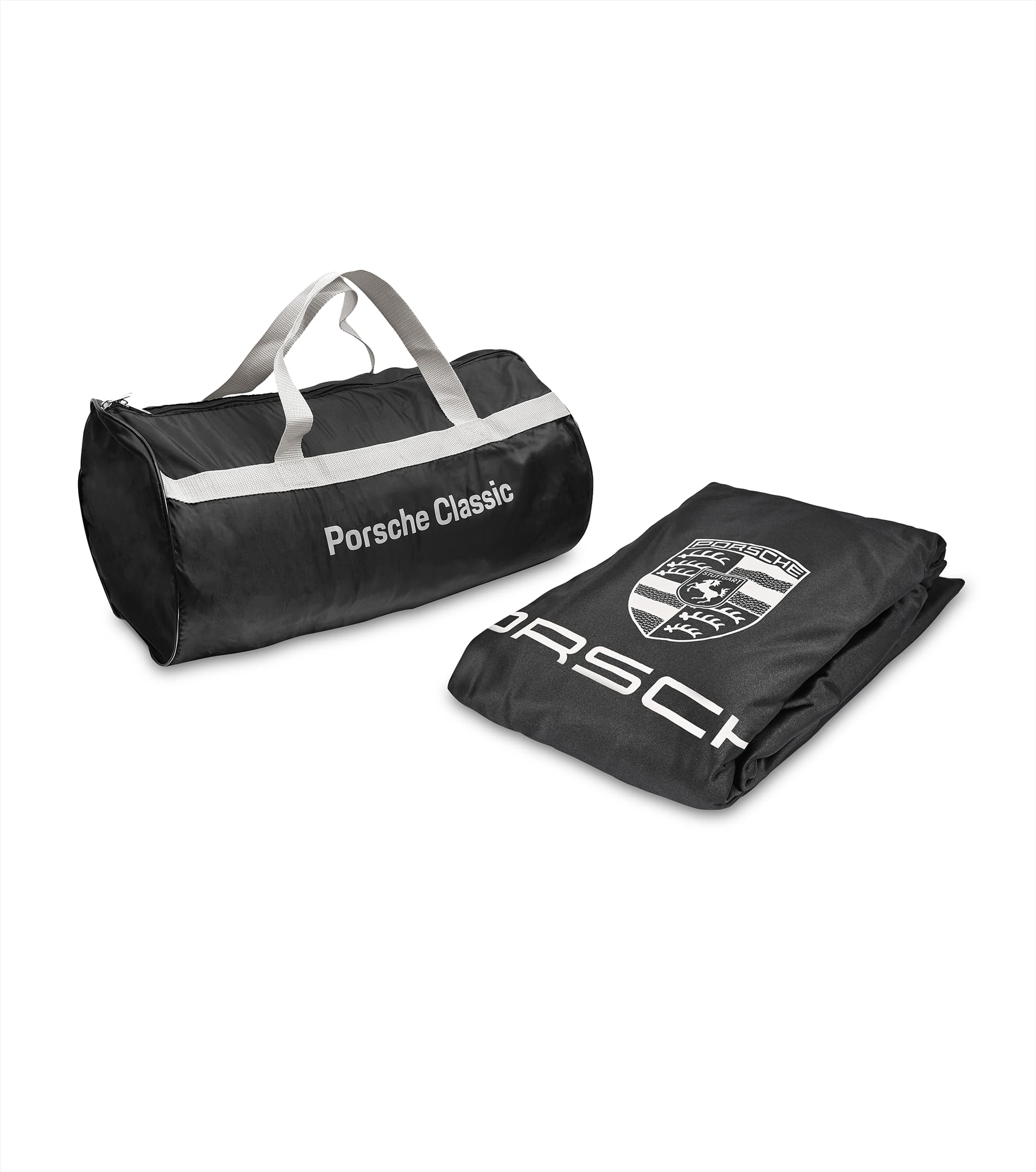 Innendørsdekke i svart sølv med Porsche-våpenskjold og tekst. Laget av 100 % polyester, antistatisk, støvavvisende og pustende. Innsiden er belagt og beskytter karosseriet mot riper.