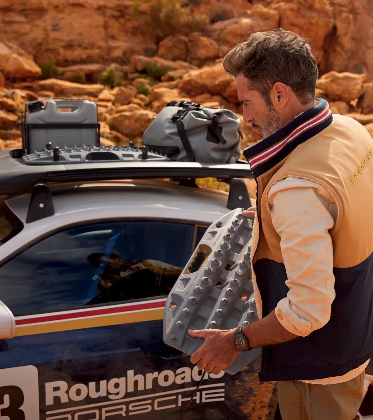 The set includes: a petrol and a water canister, canister holder, recovery boards and board holders, a folding spade and a water-repellent outdoor travel bag. All products feature the unmistakable "PORSCHE" logo and can be fastened securely to the roof for driving.