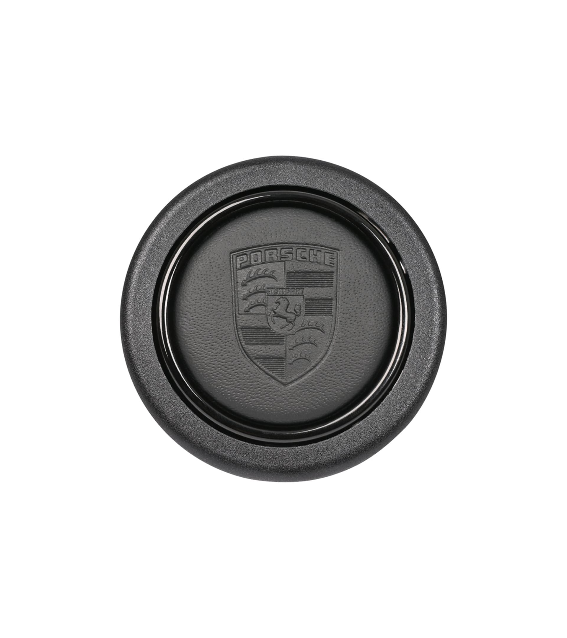 Den svarte hornknappen i ekte skinn er preget med det historiske Porsche-emblemet.