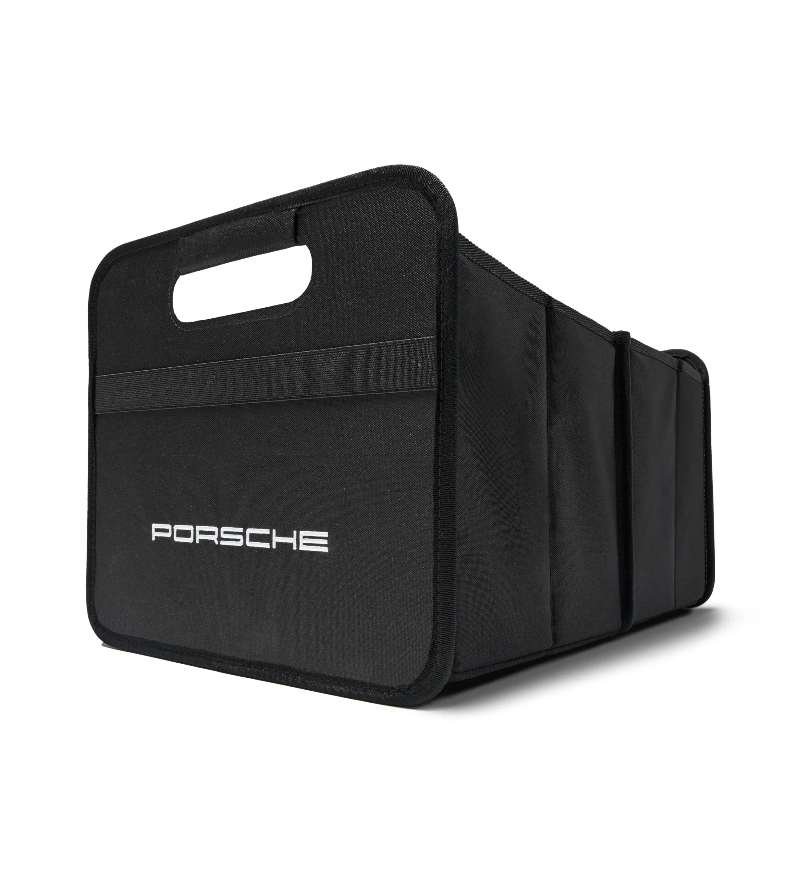 Foldeteknikken gjør at den praktiske boksen kan reduseres til et minimum. Den festes med et elastisk bånd og kan dermed ryddes perfekt bort i bagasjerommet når den ikke er i bruk. Når bagasjeromsboksen er foldet ut, har den et volum på 30 l og en bærekraft på opptil 30 kg, og oppbevarer alltid alt du trenger for turen. Når den er foldet ut, får du to separate oppbevaringsrom, hvert med et nett på siden, der både store og små gjenstander kan oppbevares på en praktisk måte. Takket være praktiske håndtak på begge sider kan bagasjeromsboksen løftes enkelt ut, selv når den er helt full, og brukes der det er behov for den. I tillegg kan den også brettes sammen slik at du kan bruke bare den ene siden. Dette gjør at den kan plasseres ikke bare i bagasjerommet, men også inne i bilen, på kontoret og overalt der du trenger den. Den gjør en god figur ikke bare når det gjelder lang levetid. Takket være utførelse i toppkvalitet, gjennomtenkt design og brodert Porsche-logo byr den på en funksjonell løsning for orden med stil. De ekstra innsatsene som fås til den sammenleggbare bagasjeromsboksen, er også praktiske og utvider bruksområdet for boksen enda mer: Flaskeinnsats, Kjølebaginnsats