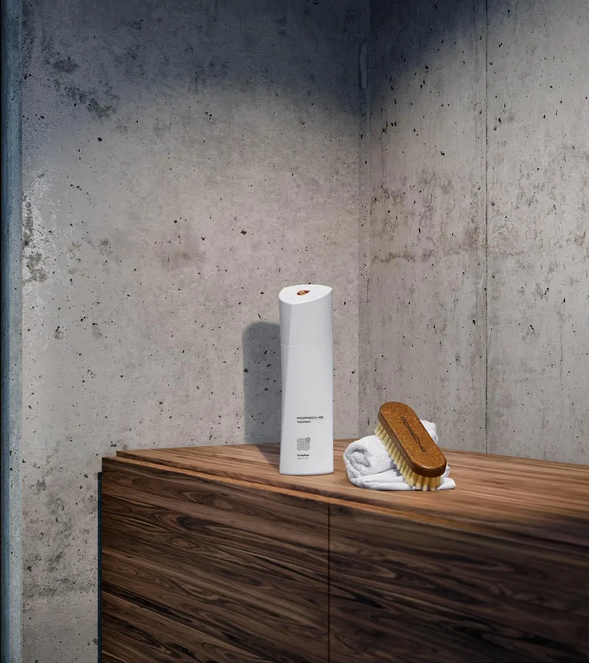 Porsches tekstilpleiesett inneholder alt du trenger for grundig rengjøring og pleie. Den fjerner til og med gjenstridig og dyptliggende smuss. Dette gjøres på en skånsom og grundig måte. Porsche-pleiesettet er egnet for nesten alle tekstiler i kjøretøyet (f.eks. Alcantara®, Race-Tex og Cordsamt). Det gir selv sterkt belastede overflater tilbake sitt edle utseende.
