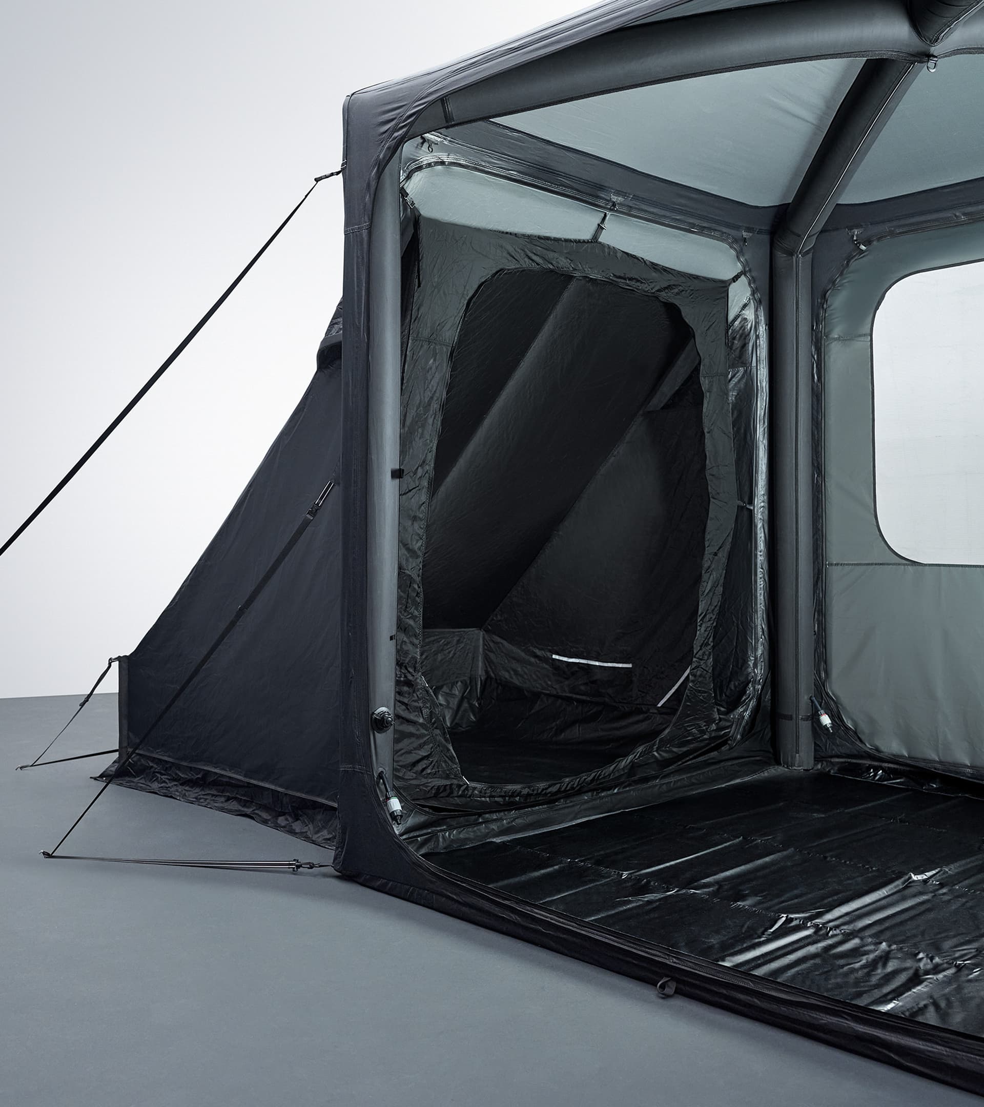 Namiot przedłużający doskonale nadaje się również jako miejsce do przechowywania. Można go łatwo i pewnie przymocować do pawilonu za pomocą zamka błyskawicznego i zapewnia on dodatkową ochronę przed warunkami atmosferycznymi, jeśli pogoda w wymarzonej lokalizacji nie jest zgodna z oczekiwaniami. Zintegrowane szczeliny wentylacyjne z moskitierą zapewniają odpowiednią wentylację. Dzięki czarno-szarej koncepcji kolorystycznej i sylwetce góry jako elementowi graficznemu, pawilon idealnie pasuje do namiotu dachowego. W połączeniu z namiotem dachowym pawilon oferuje jeszcze więcej możliwych zastosowań i zawsze zapewnia stylowe schronienie.