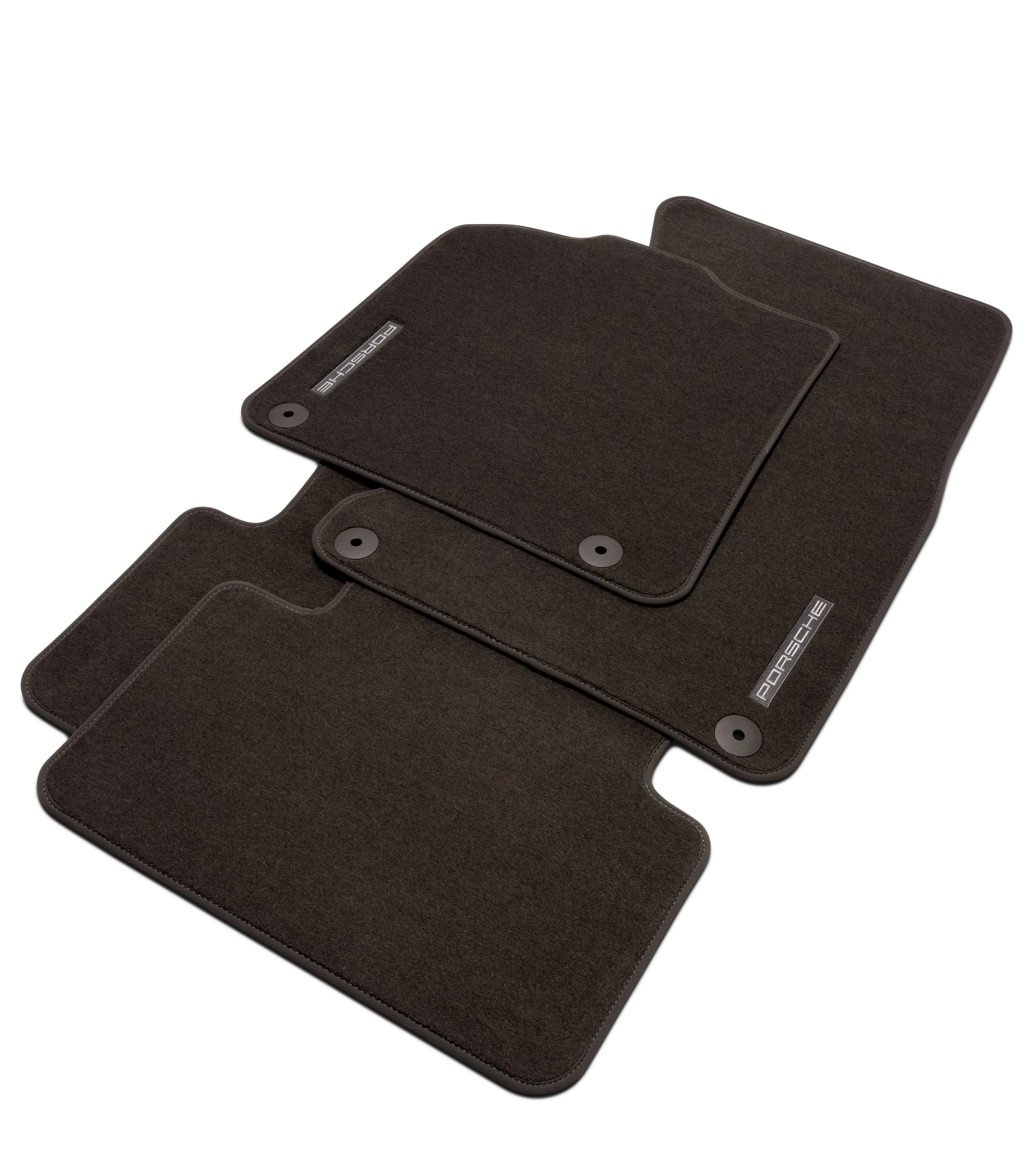 Czteroczęściowy zestaw, w wybranych kolorach wnętrza, z obszyciem z nubuku i wstawką z wyszywanym srebrnym logo „PORSCHE”.