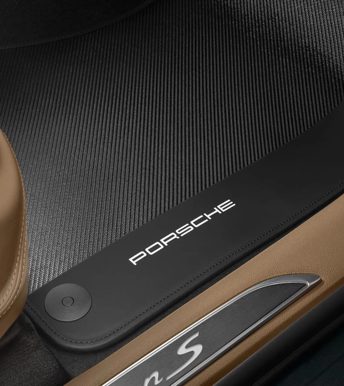 Czteroczęściowy zestaw wykonany z prawdziwego włókna węglowego ze skórzanym obszyciem i przeszyciami w kolorze czarnym. Zawiera skórzaną wstawkę w kolorze czarnym z logo „PORSCHE”.