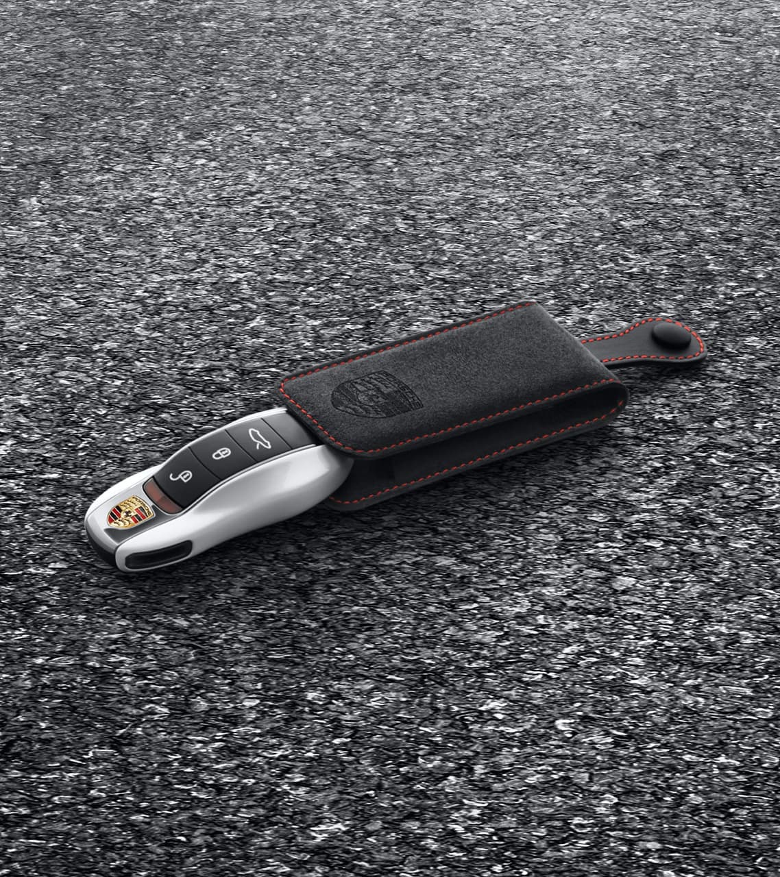 Etui na kluczyk samochodowy, wykonane z czarnej tkaniny Alcantara® z przeszyciami ozdobnymi w kolorze Guards Red i emblematem Porsche.