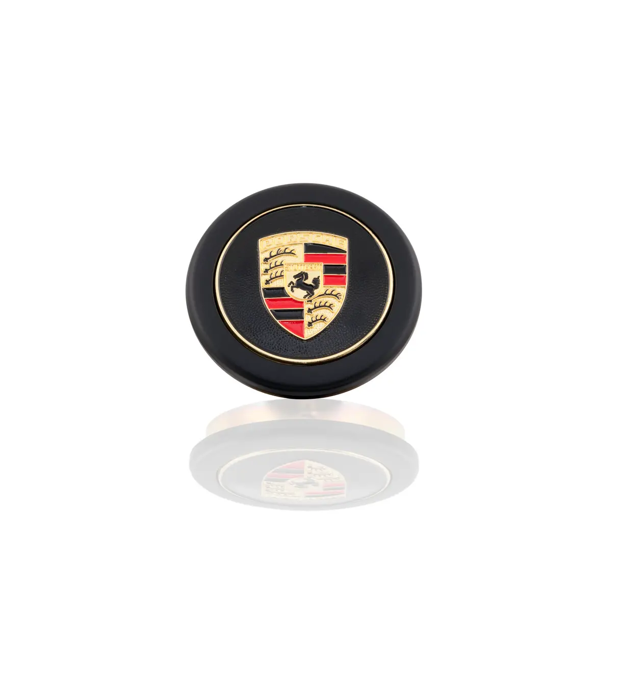 Czarny kołpak ozdobny koła z kolorowym, wytłoczonym herbem Porsche.