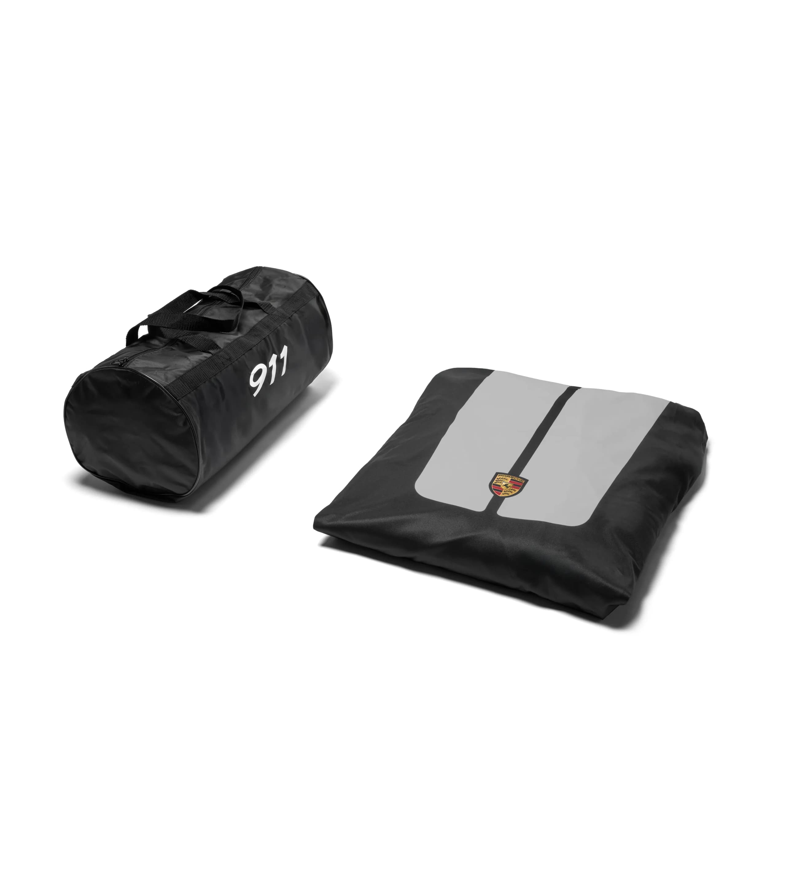 Dopasowany pokrowiec na samochód do użytku w pomieszczeniach, wykonany z oddychającego, antystatycznego i odpornego na zabrudzenia materiału. Szyty ręcznie z kontrastową lamówką, ozdobnymi paskami, napisem „PORSCHE” i kolorowym herbem Porsche. Czarna tkanina wykonana jest w 100% z poliestru i można ją prać w temperaturze 30°C.