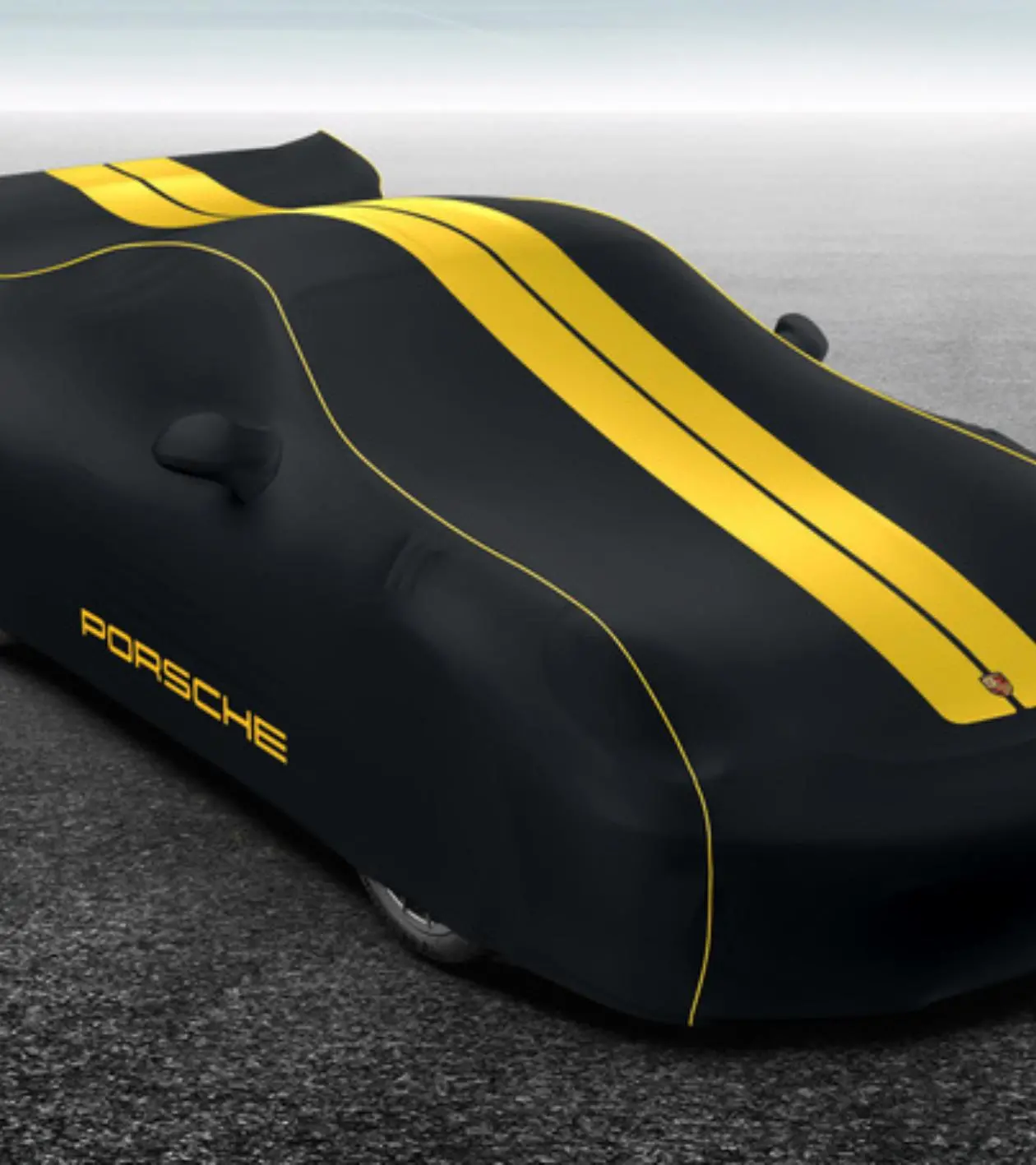 Dopasowany pokrowiec na samochód do użytku w pomieszczeniach, wykonany z oddychającego, antystatycznego i odpornego na zabrudzenia materiału. Szyty ręcznie z kontrastową lamówką, ozdobnymi paskami, napisem „PORSCHE” i kolorowym herbem Porsche. Czarna tkanina wykonana jest w 100% z poliestru i można ją prać w temperaturze 30° C.