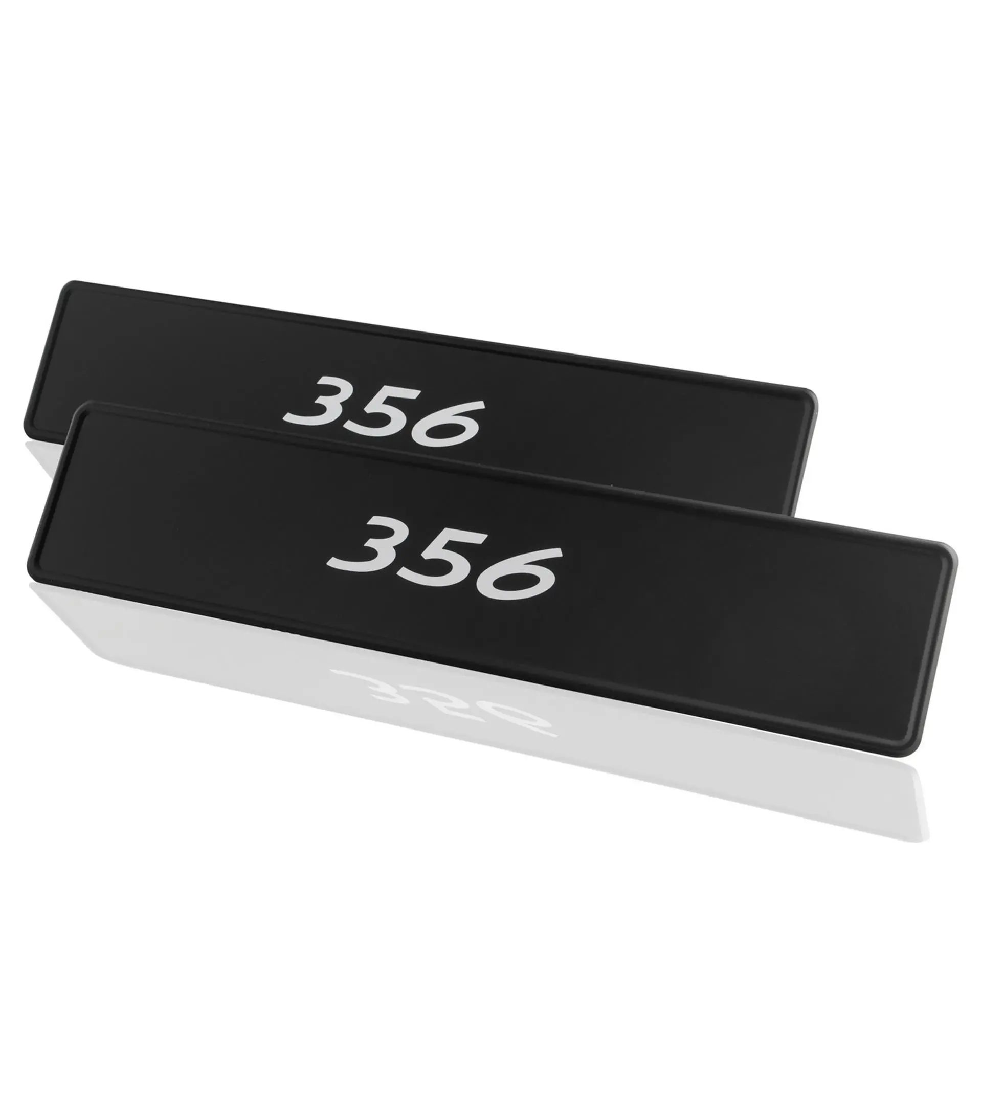 Czarna tablica rejestracyjna z białym nadrukiem „356” o wymiarach 11 x 52 cm; nadaje się do Porsche 356 z lat modelowych 1950–1965. Zawartość: 2 sztuki.