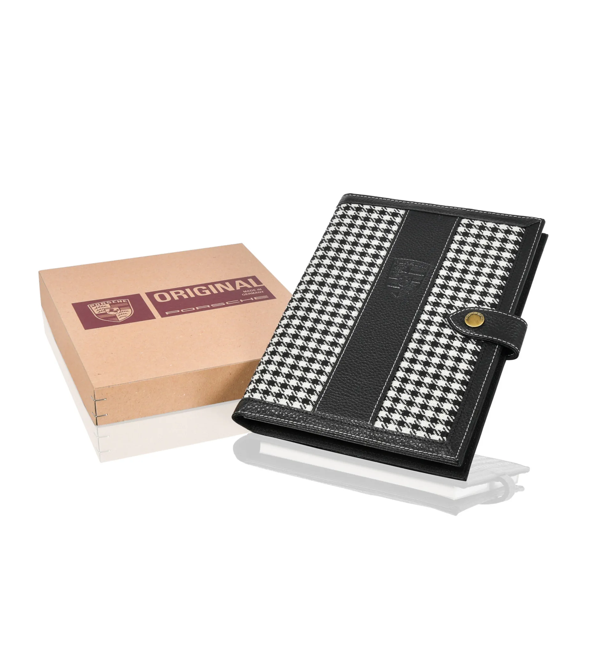Nowa teczka na dokumenty nawiązuje do stylu wnętrza 911 z lat modelowych od 1964 do 1973 i stanowi połączenie materiału w pepitkę i skóry. Wygląd dopełniają magnetyczne zamknięcie oraz wytłoczenia: herb Porsche na okładce i napis Porsche po wewnętrznej stronie. Oprócz wolnego miejsca na instrukcję obsługi oraz książeczkę z danymi dotyczącymi typu, wymiarów i tolerancji dla Twojego Porsche teczka na dokumenty zawiera także notatnik, który możesz zabrać ze sobą w każdą podróż. Dzięki temu możesz zanotować termin następnej wymiany oleju lub przejechane odległości i czas jazdy.