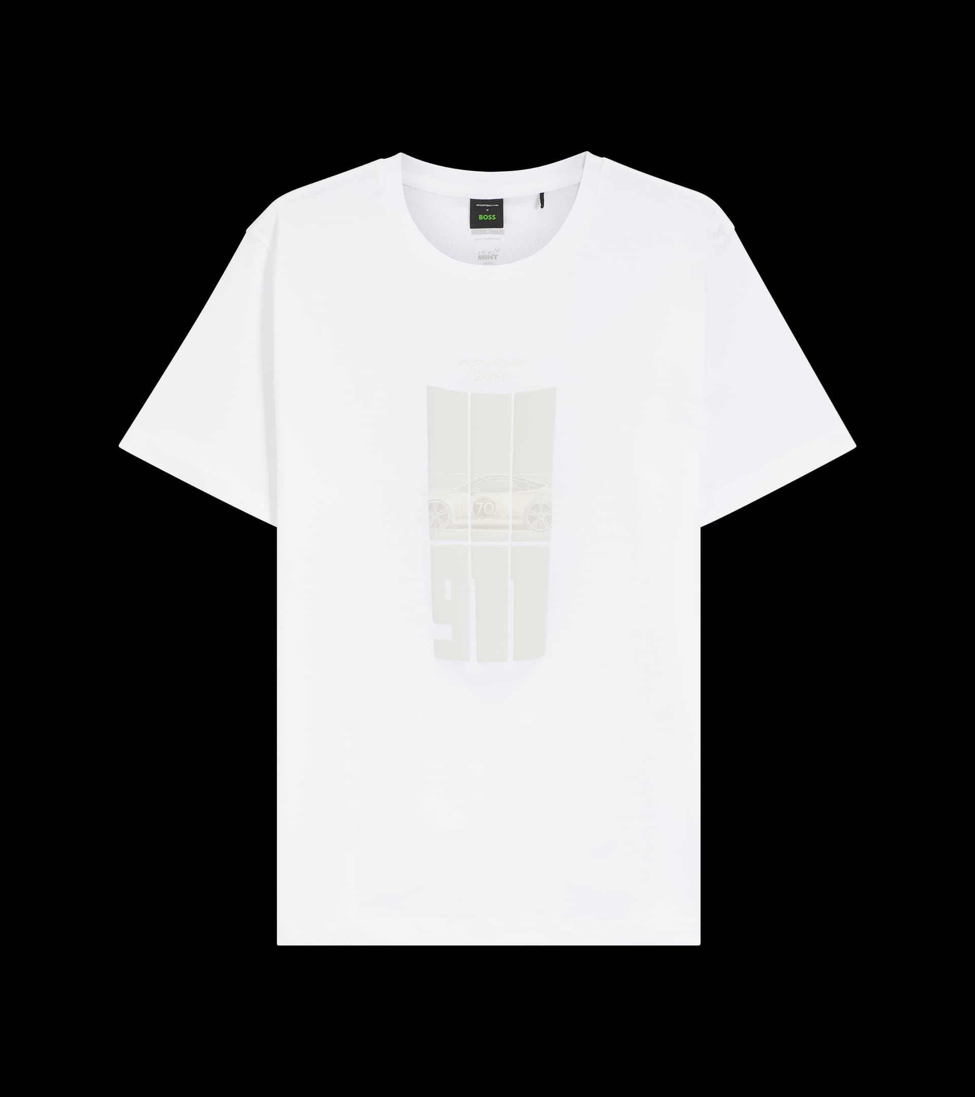 Męska koszulka Porsche x BOSS z miękkiej bawełny ozdobiona wyrazistą grafiką inspirowaną modelem Porsche 911 Spirit 70. Ozdobne odblaskowe logo. Regularny krój.HeiQ Mint to roślinny dezodorant zapewniający długotrwałą kontrolę nieprzyjemnego zapachu, dzięki któremu tkaniny pozostają świeże przez cały dzień. Zastosowano w nim technologię botaniczną, która regeneruje się przy każdym praniu.Styl łączy się z funkcjonalnością w kolekcji Porsche x BOSS, która obejmuje sportowe modele o minimalistycznej, nowoczesnej estetyce.