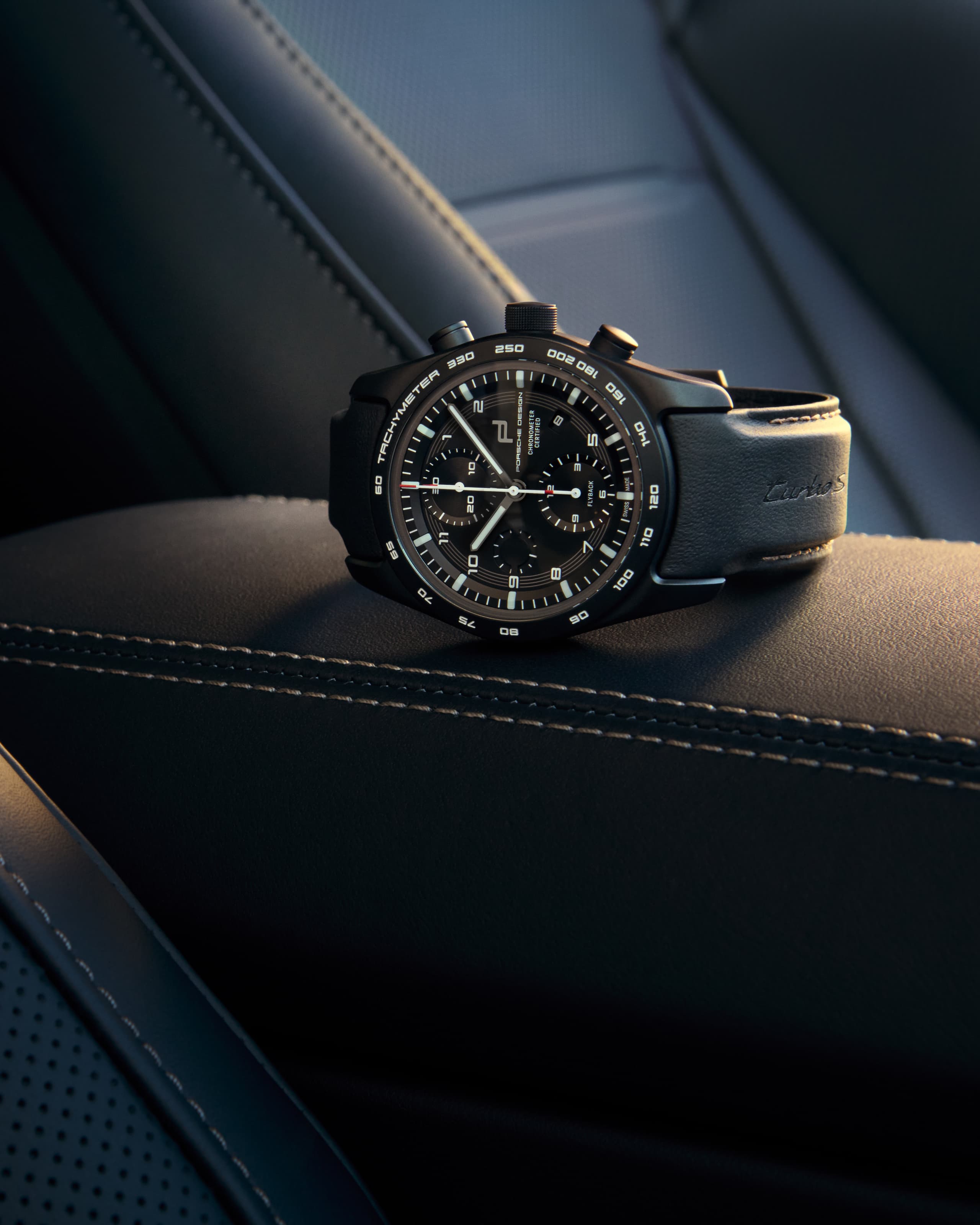 Tarcza wizualnie nawiązuje do zestawu wskaźników i obrotomierza Porsche 911, lecz zgodnie z tradycją Porsche Design została zredukowana do najistotniejszych elementów: białe cyfry i indeksy na czarnym matowym tle o subtelnie zróżnicowanej geometrii i konfigurowalne wskazówki, które są doskonale widoczne ze względu na antyrefleksyjne szkło szafirowe.