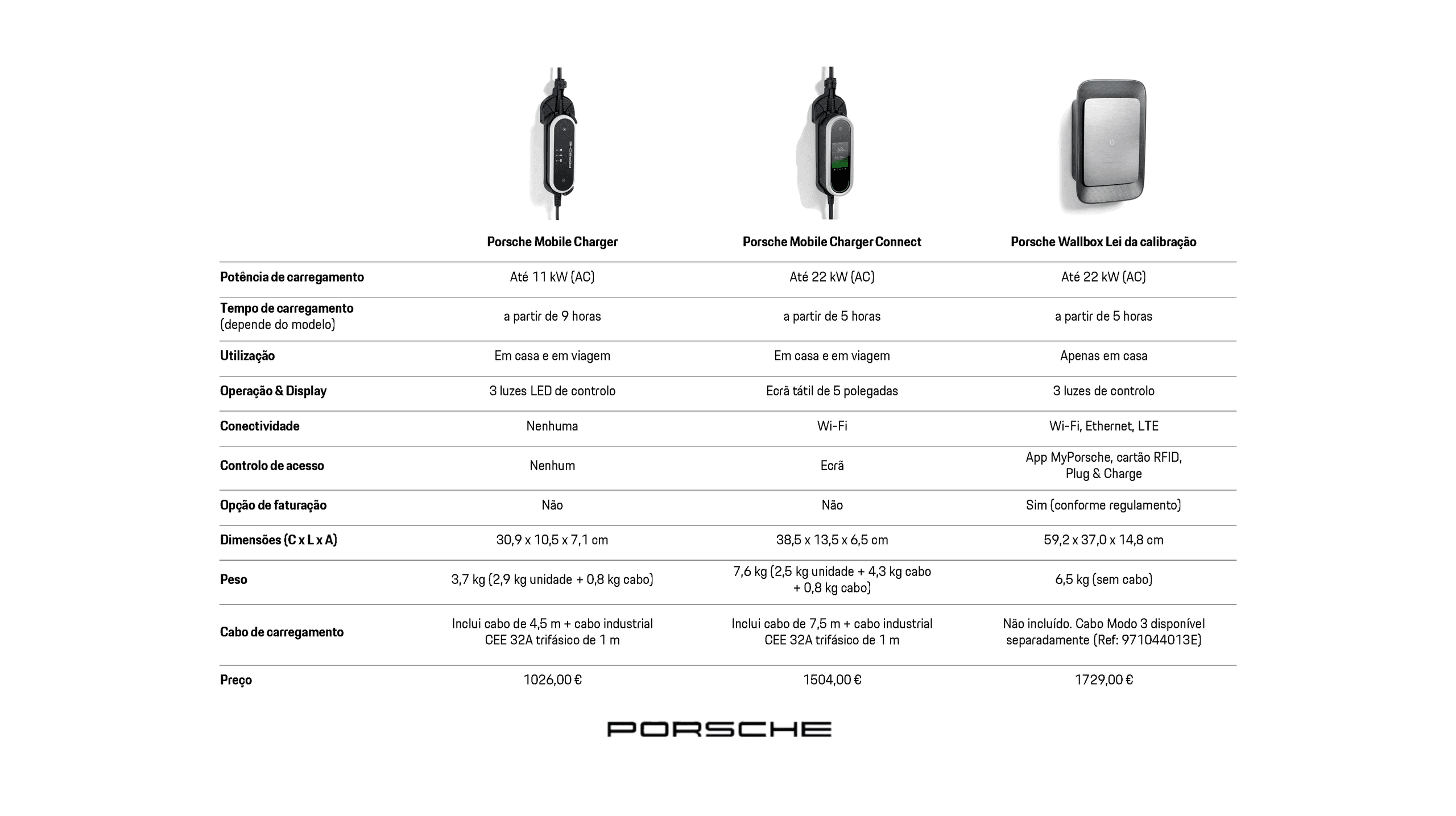 A Porsche oferece vários equipamentos de carregamento, tais como a Porsche Wallbox, o Porsche Mobile Charger e o Porsche Mobile Charger Connect. Também estão disponíveis várias opções de fixação, como a doca de carregamento ou o posto de carregamento compacto Porsche.