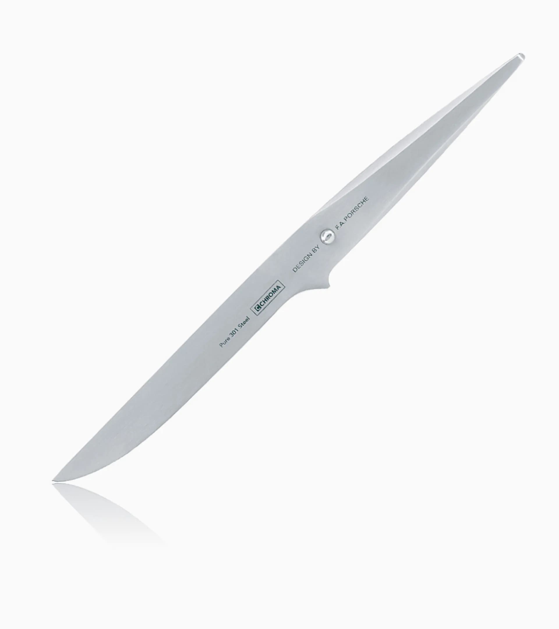 Esta faca para desossar da Porsche Design é mais do que uma simples ferramenta – é uma afirmação de design excelente e de habilidade profissional na sua cozinha. Especialmente desenvolvida para remoção de ossos e peles de carne ou aves, a faca impressiona pela sua excelente qualidade de corte e ergonomia fora de série.O cabo e a lâmina fundem-se na perfeição, garantindo um manuseamento harmonioso e suave. Apenas a marcante pérola de aço inoxidável assinala subtilmente a transição entre a lâmina e o cabo e serve também como um descanso ideal para o polegar e o indicador. A pega de conceção ergonómica está deliberadamente orientada para os métodos de trabalho dos cozinheiros profissionais que utilizam as suas facas em ângulos de corte variáveis. Graças às fases especiais da pega, é possível um manuseamento confortável e flexível sem uma posição fixa.Fabricada em aço japonês Pure 301 de alta qualidade, a lâmina garante durabilidade e uma afiação excecional para satisfazer até as mais elevadas exigências. Design criado pelo Studio F. A. Porsche.
