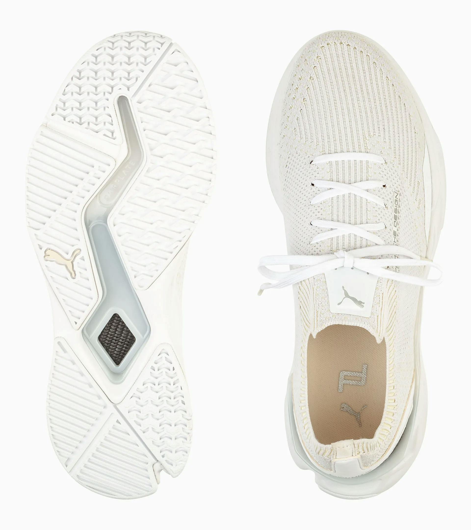 Exclusivas sapatilhas desportivas PWRPlate da Porsche Design em EvoKNIT® com fio "Glow in the Dark". Fibra de carbono no calcanhar e acabamento para grande estabilidade e amortecimento macio.