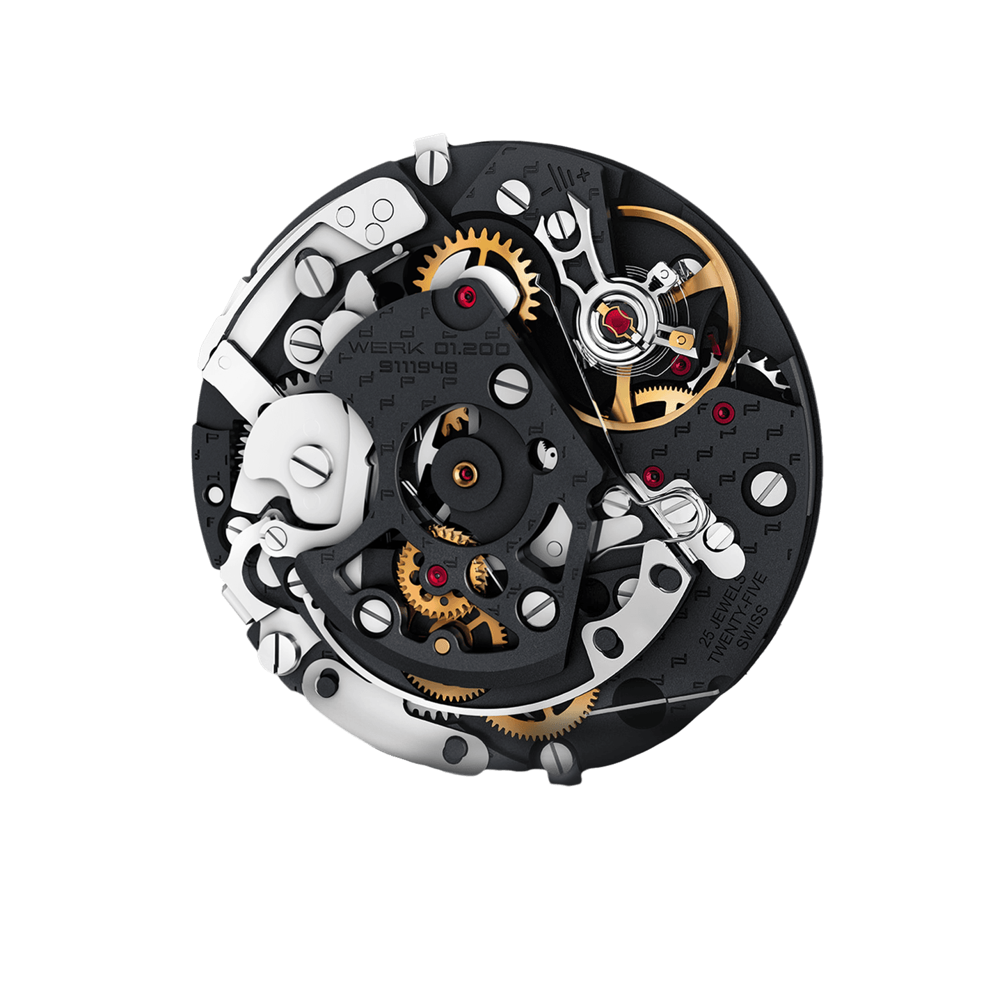 O design do rotor baseia-se no aro do 911 Turbo S Exclusive Series e é pintado com a cor original. O rotor é montado no mecanismo com o fecho central e o brasão Porsche e uma inserção parcial de tungsténio garante um comportamento de enrolamento altamente potente. Tal como acontece com o veículo, poderá escolher entre um rotor com nuances douradas ou uma versão totalmente em preto.