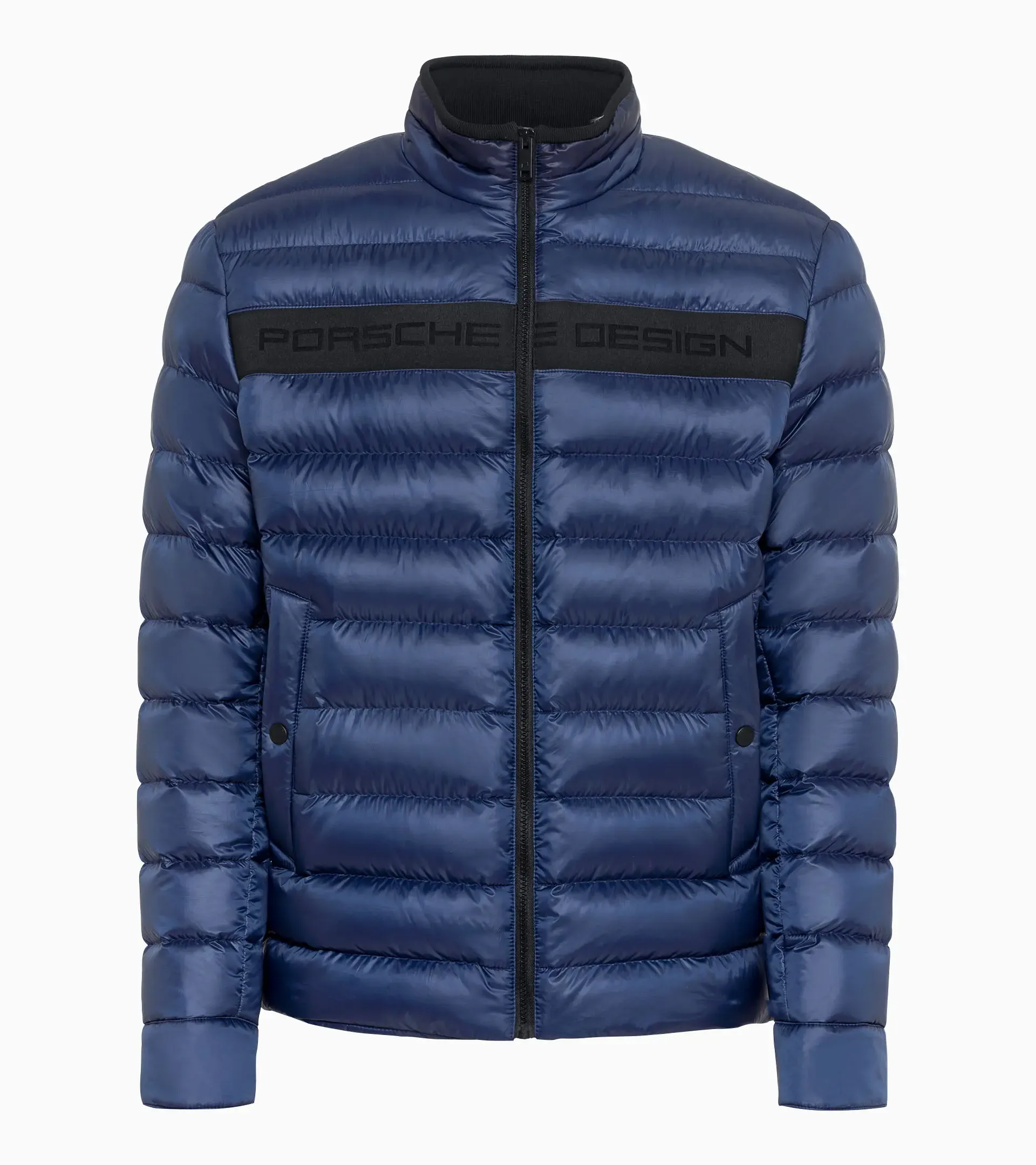 Light as a feather – without any feathers: the straight-cut jacket with down-free filling is perfect for the transitional seasons. The two pockets at hip height can be closed with press studs and the pockets on the inside can be closed with zips. Refined details typical of Porsche include the knitted fabric on the inside of the stand-up collar and the Porsche Design tape on the front of the jacket.